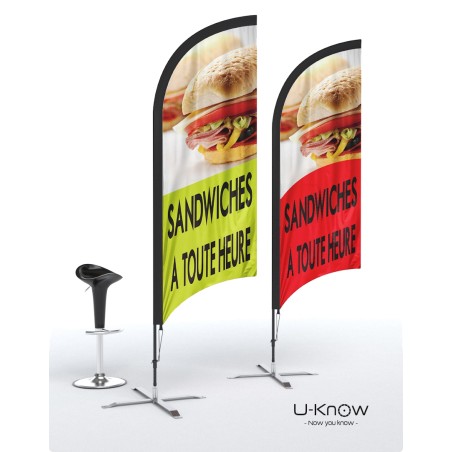 Beach flag classique en forme d'aile d'avion ou plume de 2,4m de hauteur. Voile oriflamme en matière 100% polyester 115g/m². 2 techniques d'impressions possibles : numérique ou sérigraphique (MOQ de 50 pcs en sérigraphie). En impression recto seul, le visuel est visible sur l'autre côté par transparence. En impression numérique, il est possible d'imprimer en recto/verso ; une feuille occultante insérée entre les deux côtés permet d'avoir une meilleure lisbilité. Le fourreau noir de la voile est renforcé et fabriqué dans un polyester Oxford 300 D. Le mât est en fibre de carbone (très résistant). Les mâts se fixent sur tous les pieds de la même manière. L'axe de rotation présent sur les pieds pivote à 360°. Les voiles se tendent sur tous les mâts grâce à un élastique. Utilisation intérieure et extérieure. Garanti pour un vent inférieur à 70 km/h..Structure disponible sur stock dans notre entrepôt parisien, impression réalisée après validation de la commande
