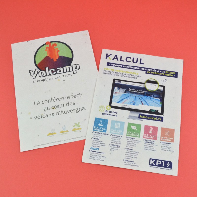 Papier à semer A5 (210x148mm) épaisseur 200g contenant des graines, entièrement personnalisé à votre communication. À planter directement en terre pour permettre aux semences de pousser !