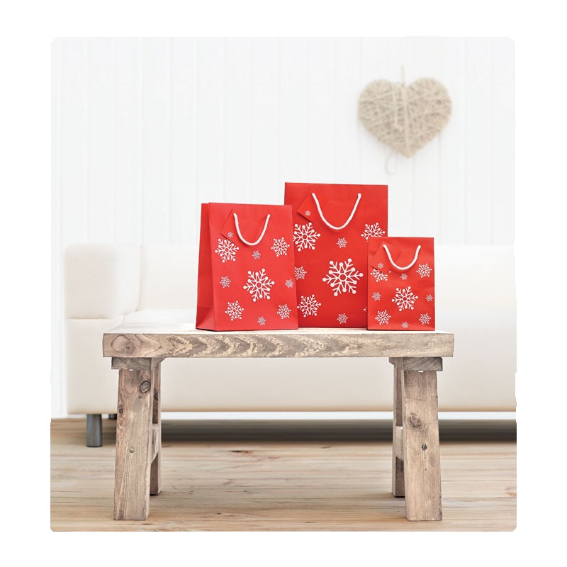 Elégant sac cadeau en papier décoré de motifs de flocons de neige. Petite carte message incluse. Petit modèle. FSC®-certified | FSC 100%, P5.3, FSC-C213206