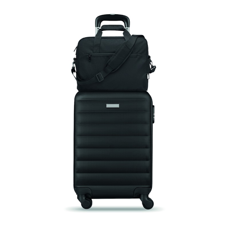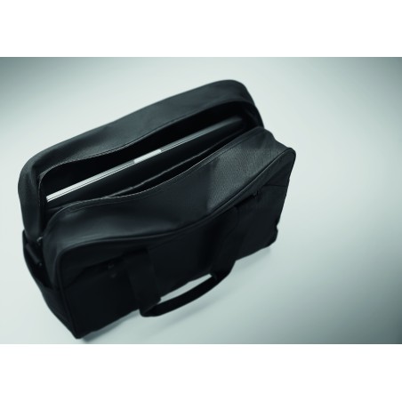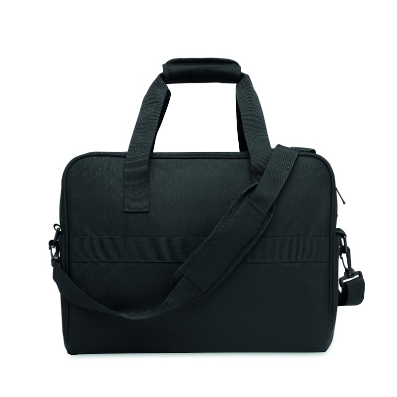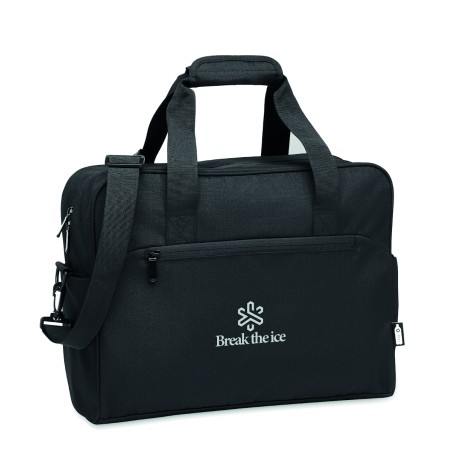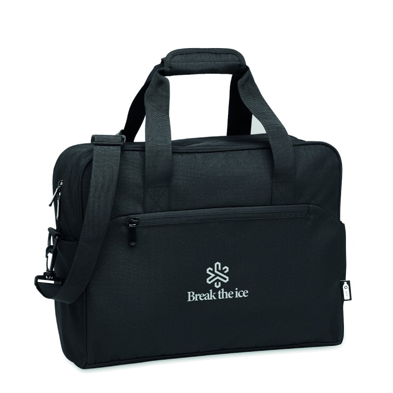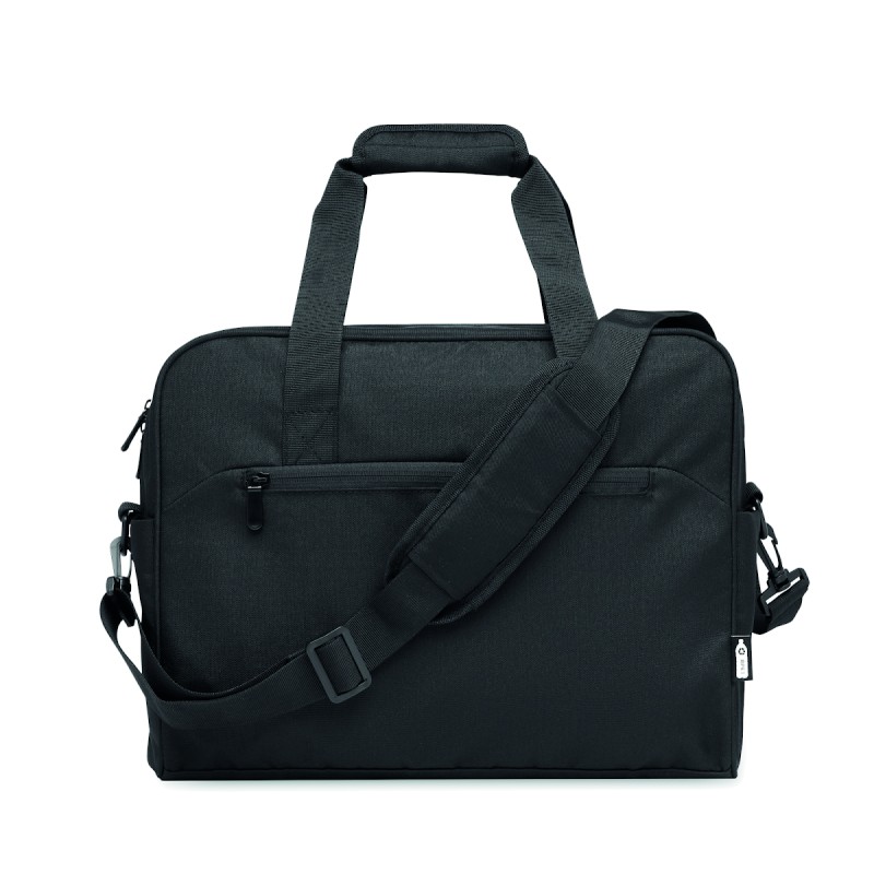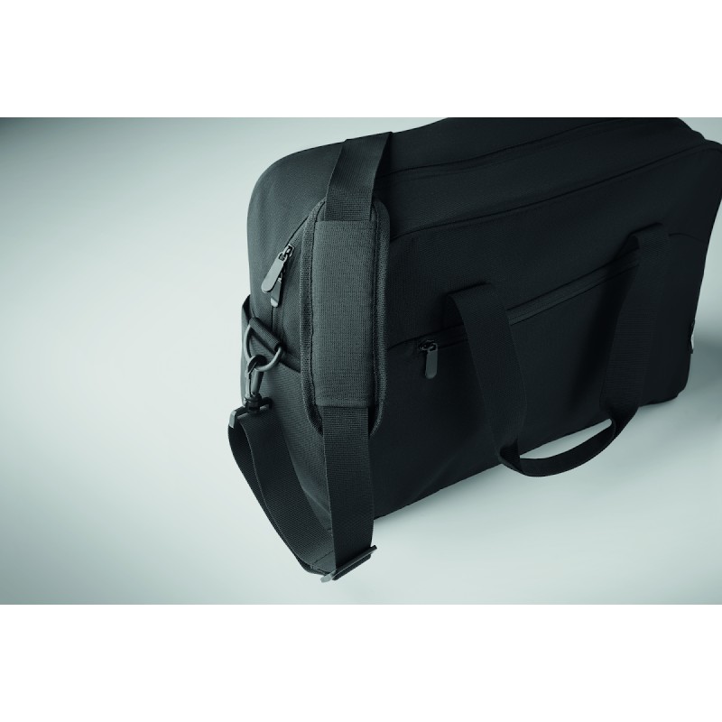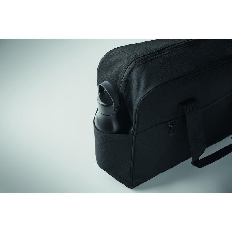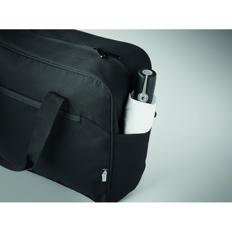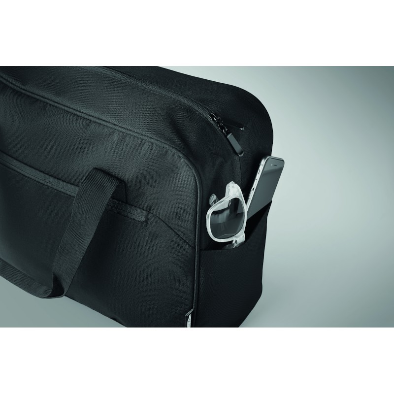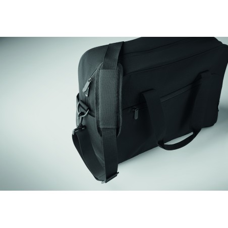 Sac de voyage pour bagage à main en 600D RPET avec grande poche frontale zippée, deux petites poches latérales. Comprend un compartiment pour ordinateur portable de 15 pouces. Bandoulière rembourrée, amovible et réglable. Porte-trolley au verso.