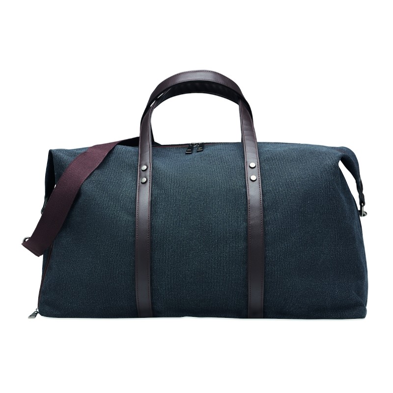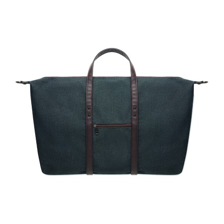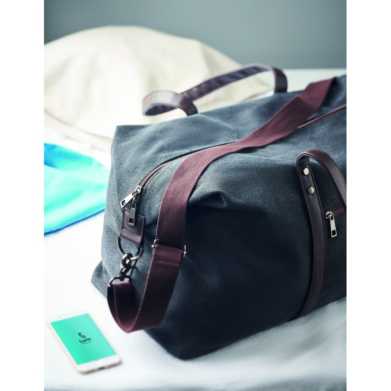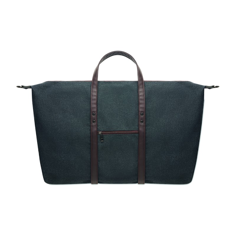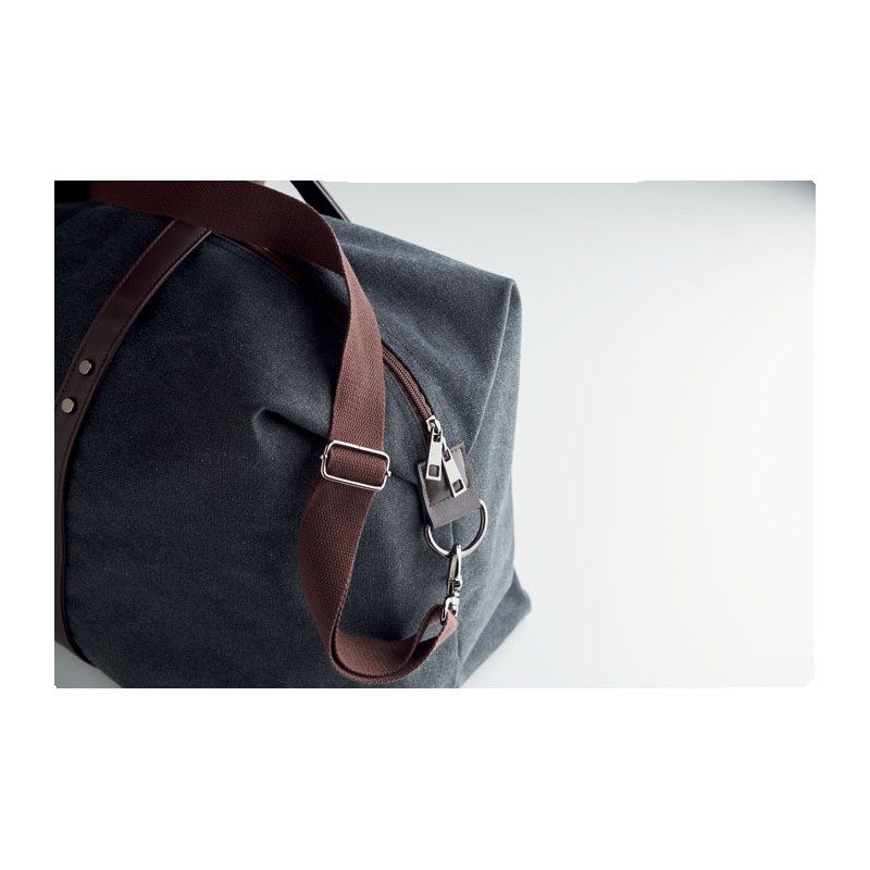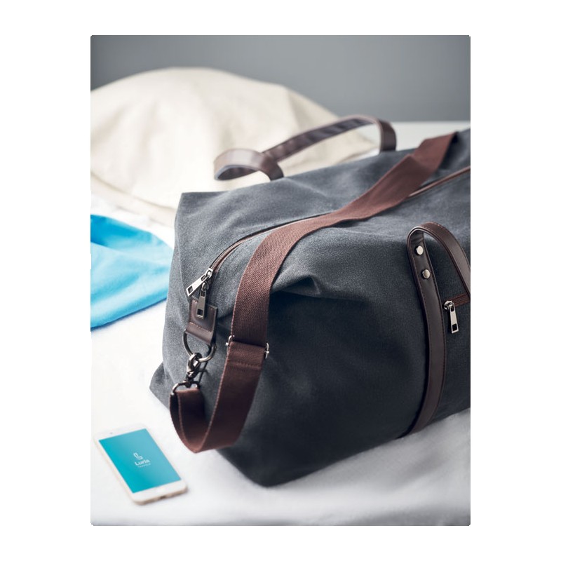 Sac de week-end en toile lavée de 450 gr/m² de haute qualité avec détails en PU recyclé. La doublure est en RPET 210D. Sangles solides, réglables et amovibles incluses. Taille parfaite pour un bagage à main.