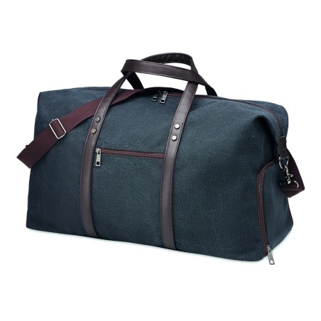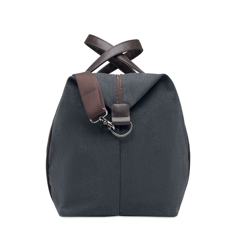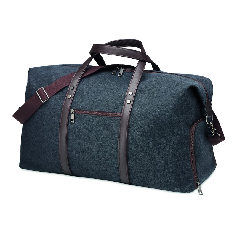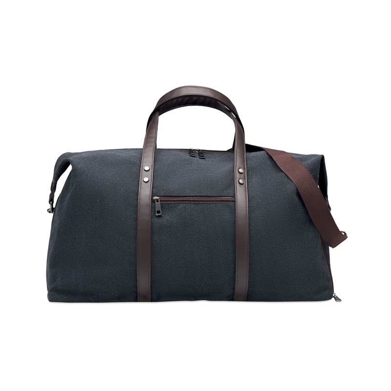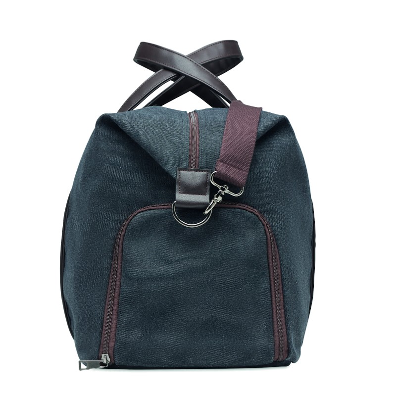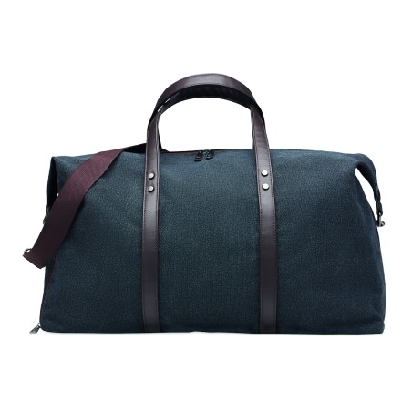 Sac de week-end en toile lavée de 450 gr/m² de haute qualité avec détails en PU recyclé. La doublure est en RPET 210D. Sangles solides, réglables et amovibles incluses. Taille parfaite pour un bagage à main.