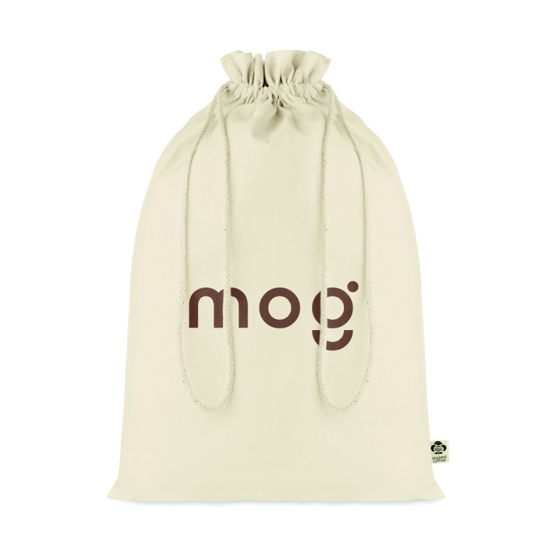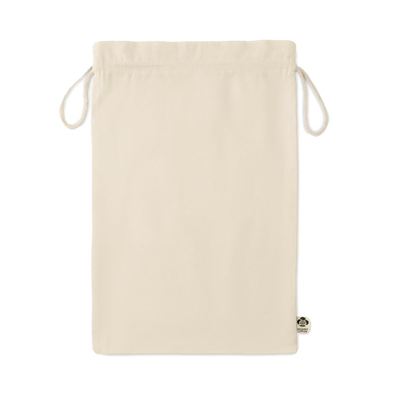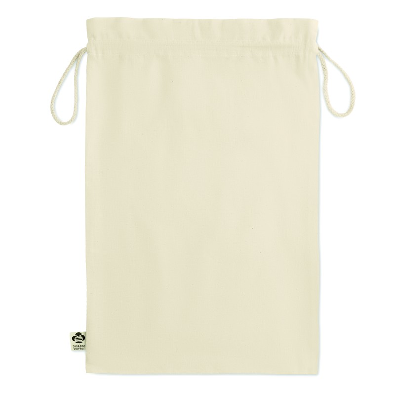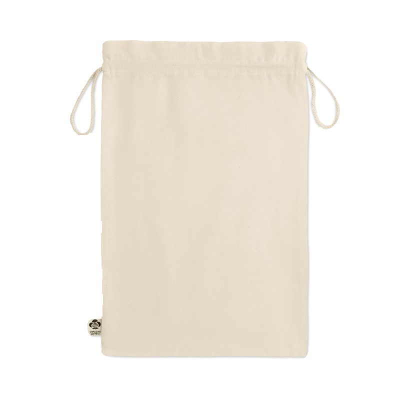 Grand sac cadeau à cordon en coton biologique. Taille environ 30 x 47 cm. 105 gr/m².