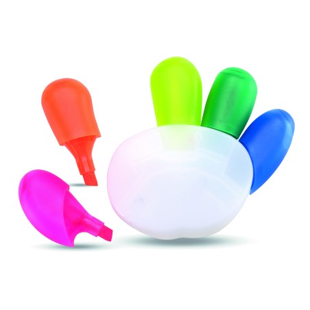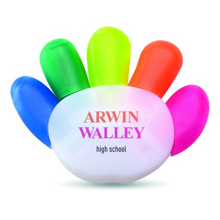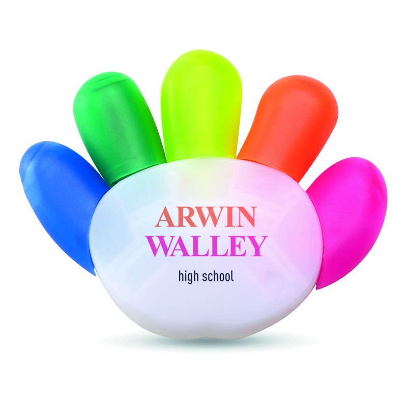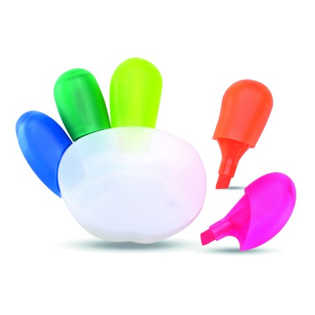 Surligneur 5 couleurs en forme de main. Grande surface d'impression.