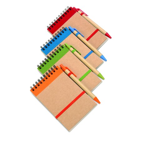 Carnet à spirale en papier recyclé avec stylo assorti. 140 pages en papier recyclé ordinaire (70 feuilles). Stylo à bille à bouton poussoir assorti en carton recyclé et plastique biodégradable. Encre bleue. Bande élastique de fermeture et passant à stylo. FSC®-certified | FSC MIX, P7.1, FSC-C213206