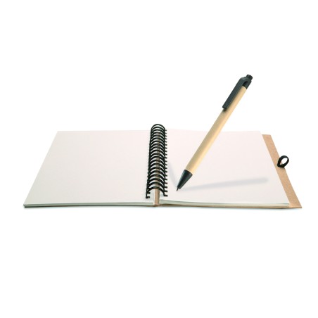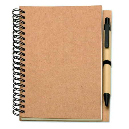 Carnet à spirale en papier recyclé avec stylo. 140 pages en papier recyclé ordinaire (70 feuilles). Stylo à bille à bouton poussoir en carton recyclé et plastique biodégradable. Encre bleue. Porte-stylo élastique noir. FSC MIX CREDIT | P7.1 | FSC-C213206