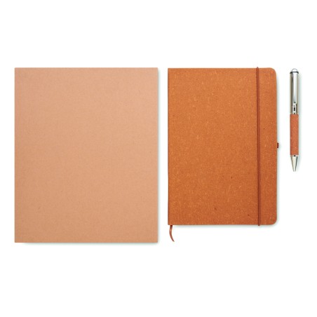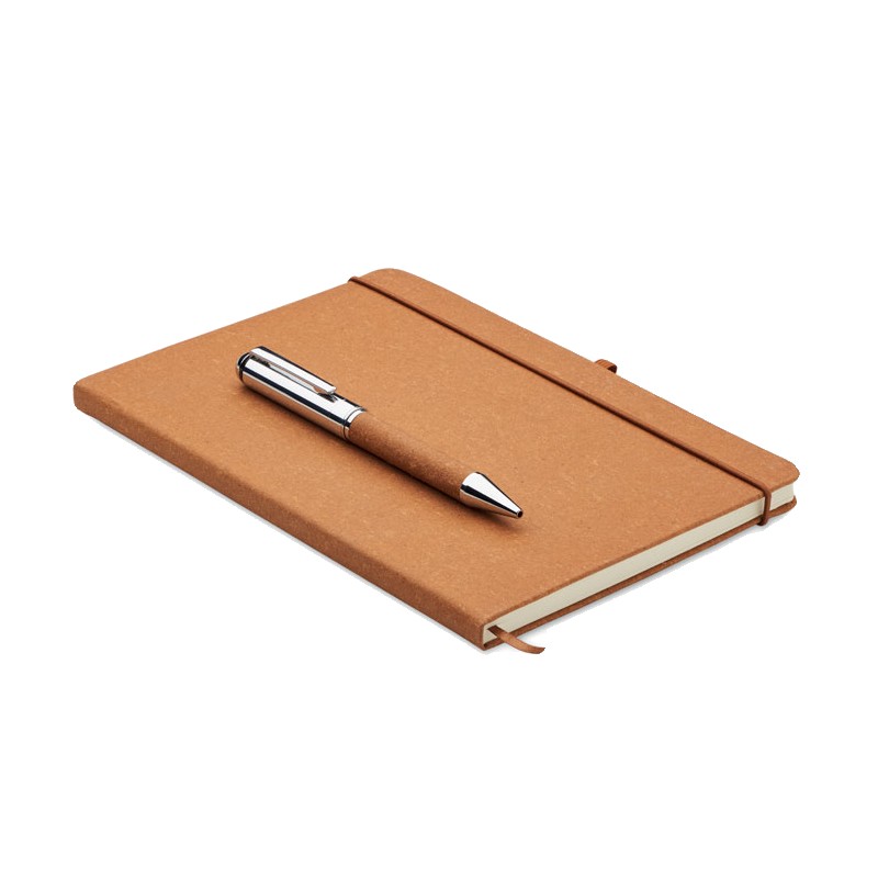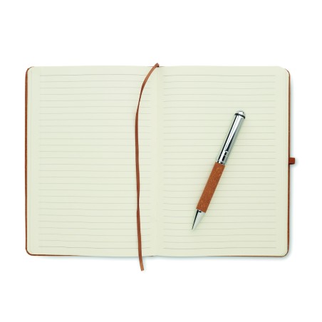 Coffret cadeau. Carnet A5 en cuir recyclé (75%) avec couverture rigide. 160 pages lignées (80 feuilles). Fermeture élastique, marque-page et porte-stylo. Stylo métallique twist assorti. Encre bleue. Présenté dans une boîte en papier kraft. FSC®-certified | FSC MIX CREDIT, P7.1, FSC-C213206