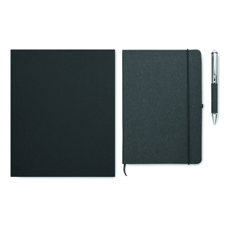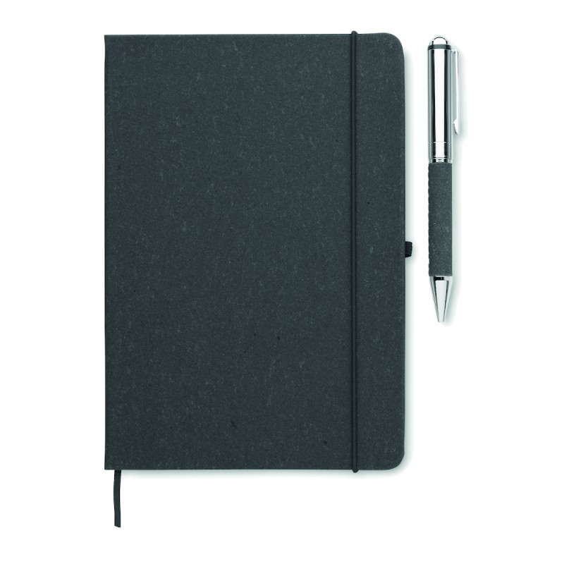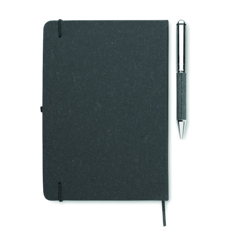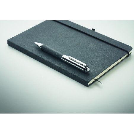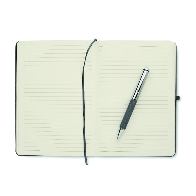 Coffret cadeau. Carnet A5 en cuir recyclé (75%) avec couverture rigide. 160 pages lignées (80 feuilles). Fermeture élastique, marque-page et porte-stylo. Stylo métallique twist assorti. Encre bleue. Présenté dans une boîte en papier kraft. FSC®-certified | FSC MIX CREDIT, P7.1, FSC-C213206