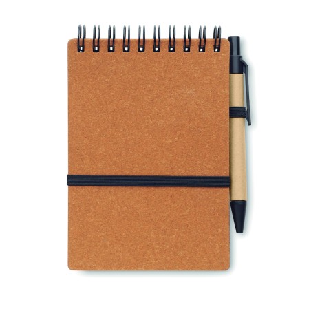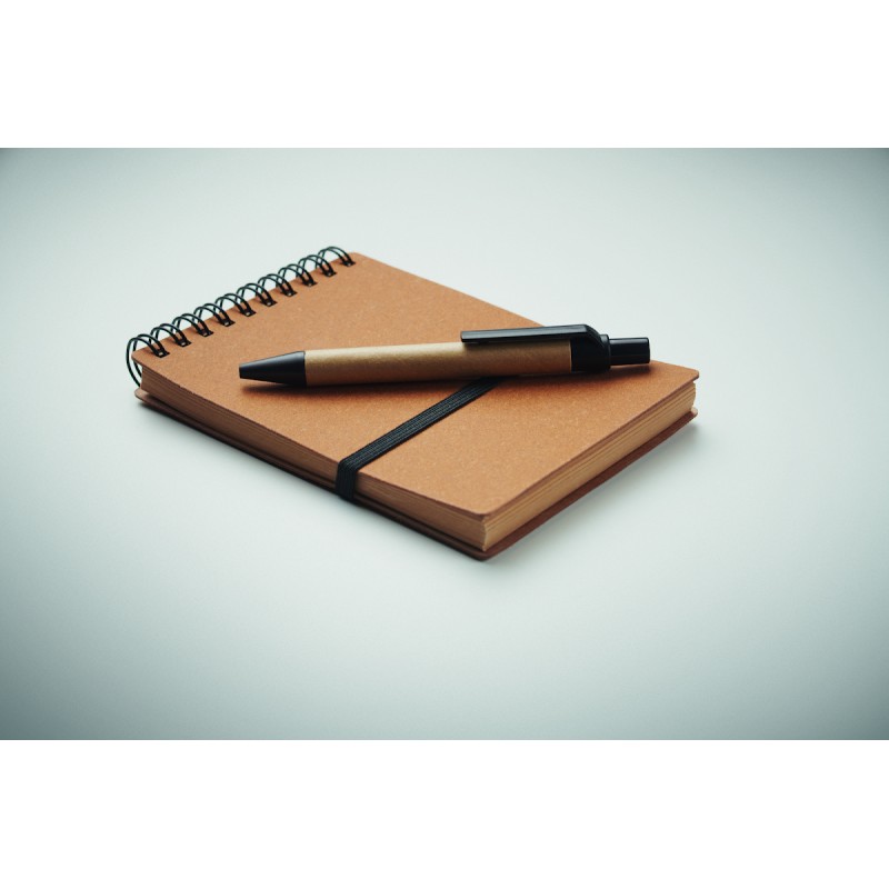 Carnet avec papier recyclé et couverture en PU (70 % de papier recyclé et 30 % de PU). Reliure à spirale. 140 pages lignées en papier recyclé (70 feuilles). Stylo bille à bouton poussoir assorti en carton recyclé et pièces en ABS. Encre bleue. Fermeture élastique et porte-stylo. FSC®-certified | FSC MIX CREDIT, P7.1, FSC-C213206
