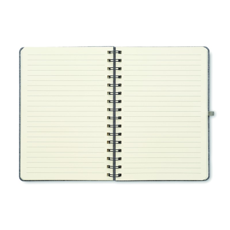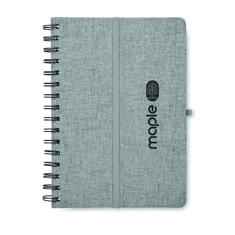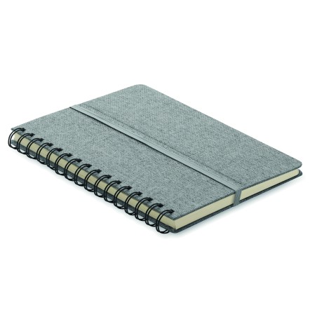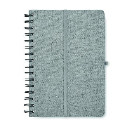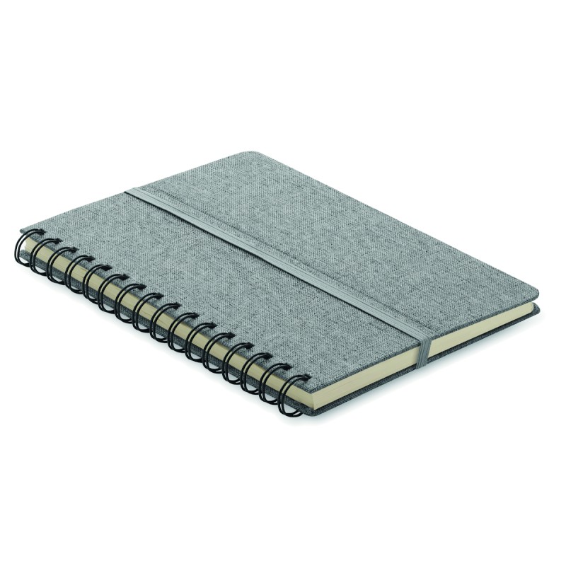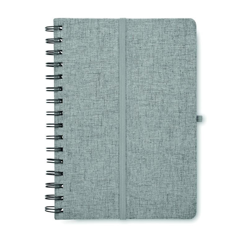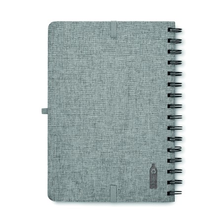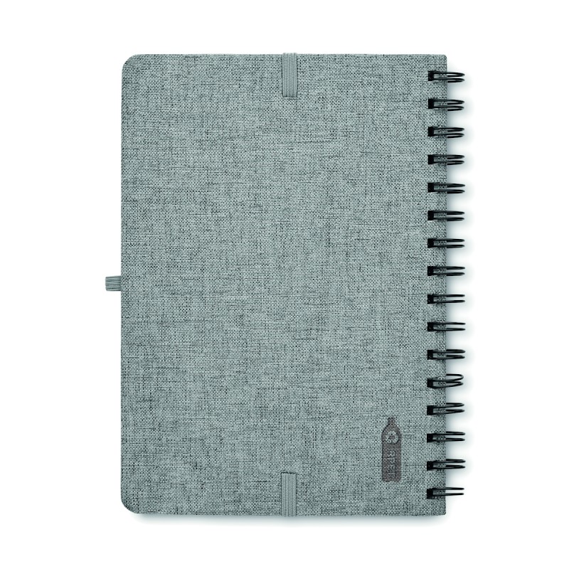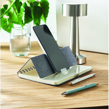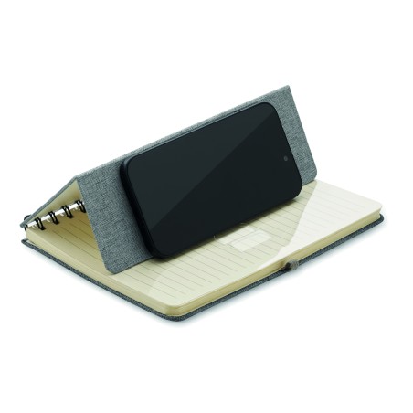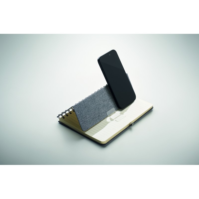 Carnet A5 avec couverture rigide en 600D RPET et fonction de support pour smartphone. Reliure à spirale. 160 pages lignées (80 feuilles). papier recyclé 70 g/m². Fermeture par élastique.