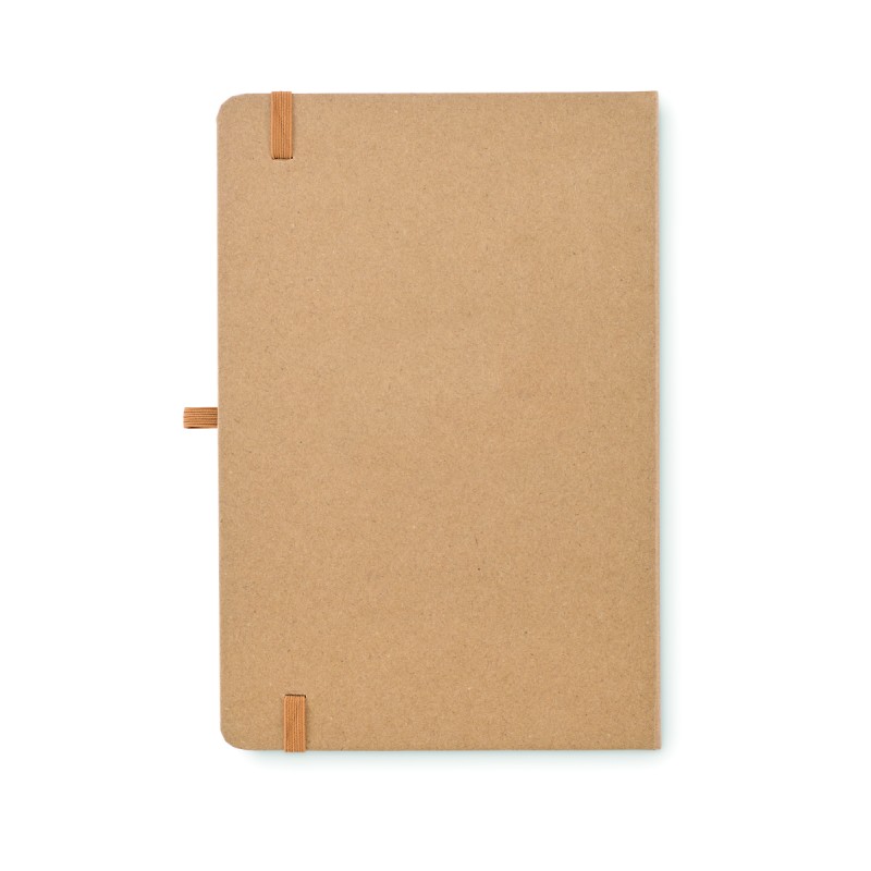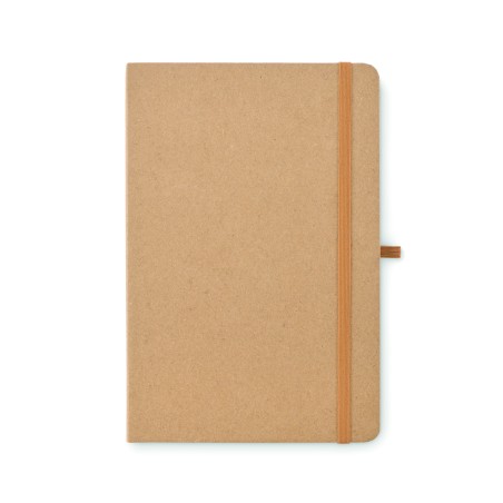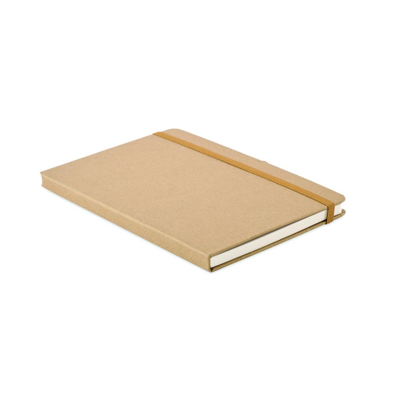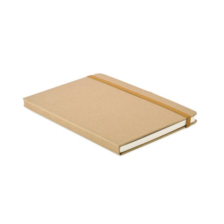 Carnet A5 avec couverture en carton comprenant 80 feuilles de papier recyclé (160 pages), 25 feuilles de notes autocollantes et 25 blocs-notes. Fermeture élastique et passant pour stylo.