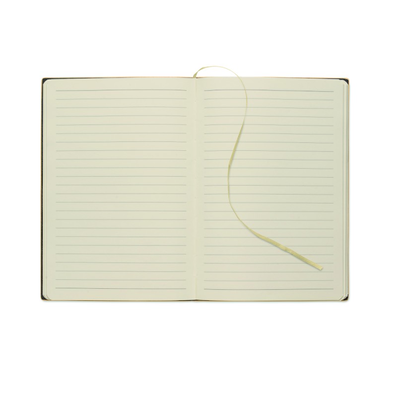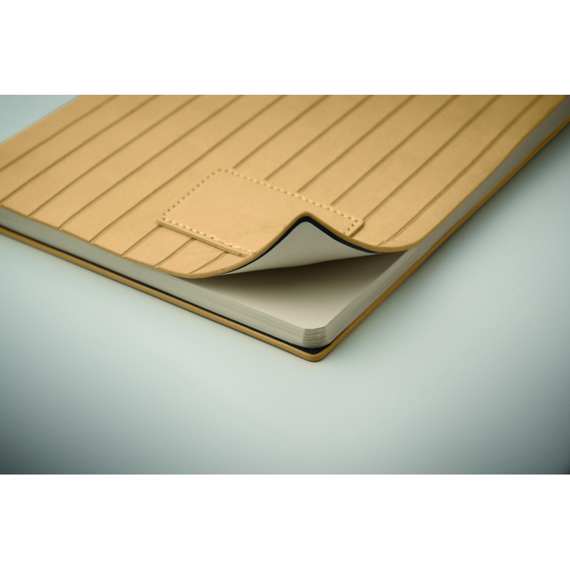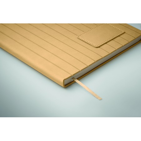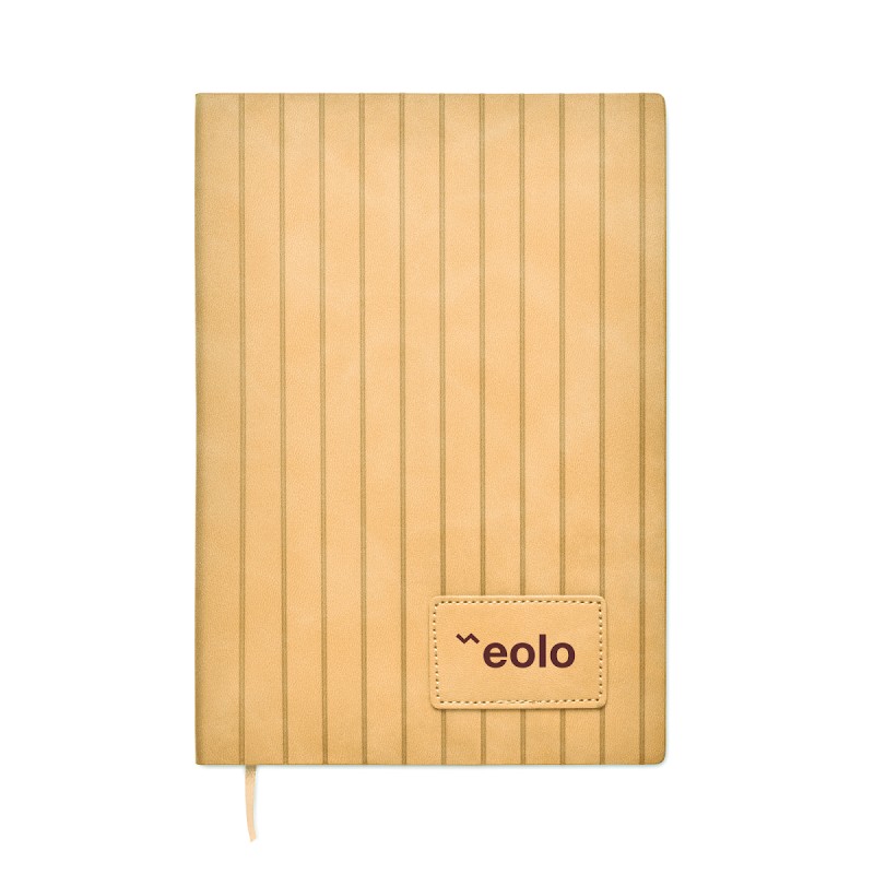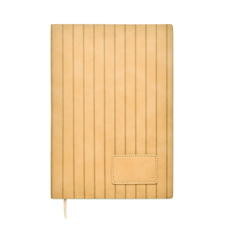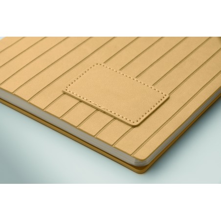 Carnet A5 avec couverture souple nervurée en PU effet patiné en 40% recyclé post-consommation et 60% PU avec patch en PU uni. 160 pages lignées, papier recyclé 70gsm (80 feuilles). Marque-page en ruban polyester de couleur assortie.