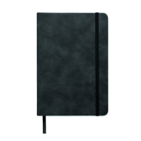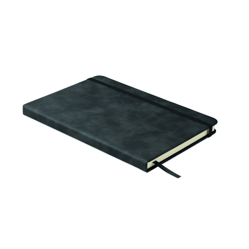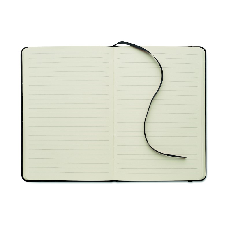 Carnet A5 avec couverture rigide en polyuréthane effet patiné recyclé à 40% et couverture en polyuréthane à 60%. Reliure dos collé. 160 pages lignées, papier recyclé 70 g/m² (80 feuilles). Elastique et Ruban marque pages assortie.