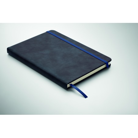 Carnet A5 avec couverture rigide en polyuréthane effet patiné recyclé à 40% et couverture en polyuréthane à 60%. Reliure dos collé. 160 pages lignées, papier recyclé 70 g/m² (80 feuilles). Elastique et Ruban marque pages assortie.