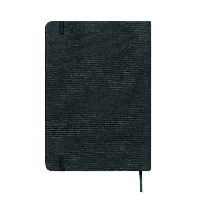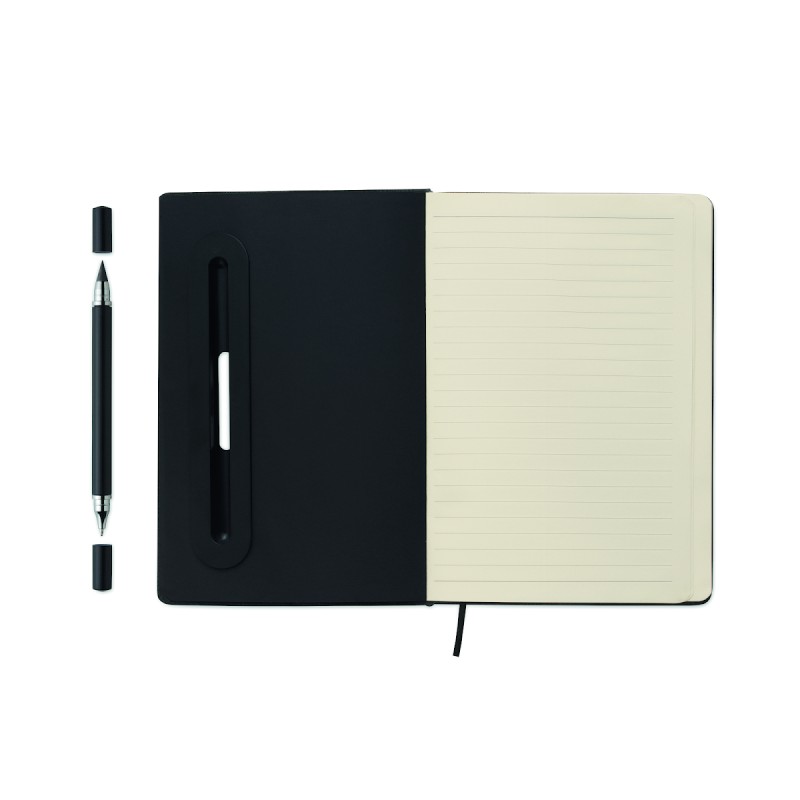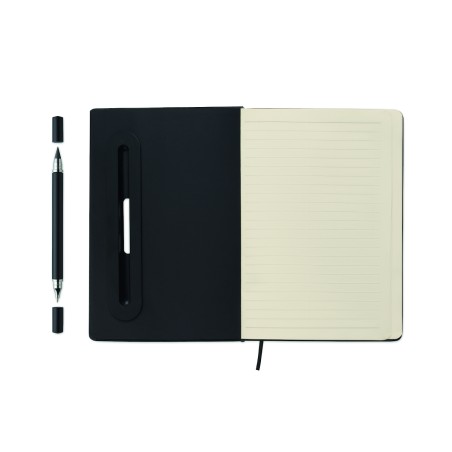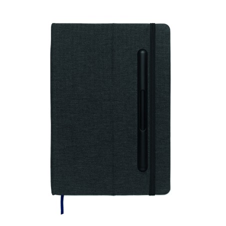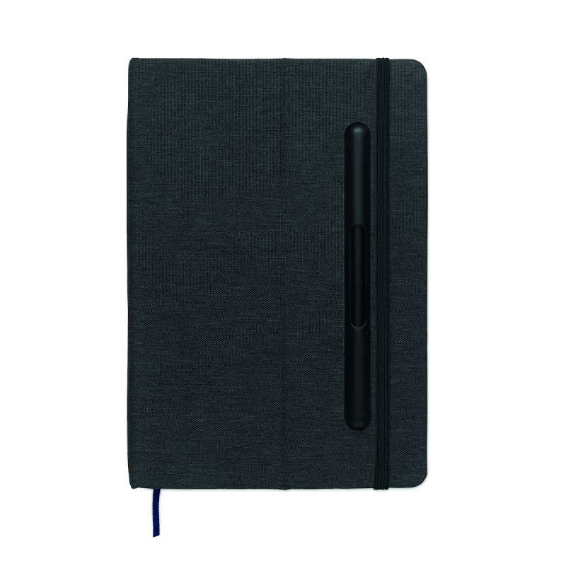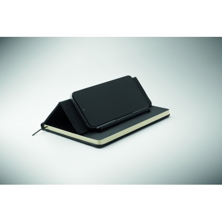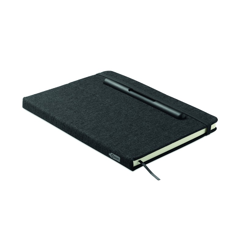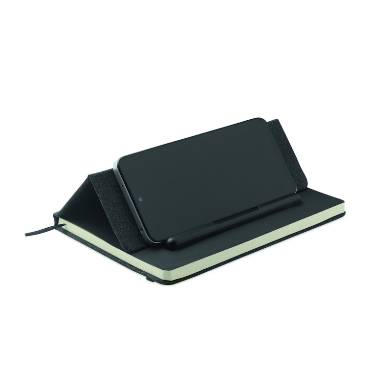 Carnet A5 avec couverture rigide en RPET et fonction support de téléphone. Stylo-bille 2-en-1 intégré en ABS. Reliure dos collé. 192 pages lignées en papier recyclé (96 feuilles). Elastique et marque-page assortis.