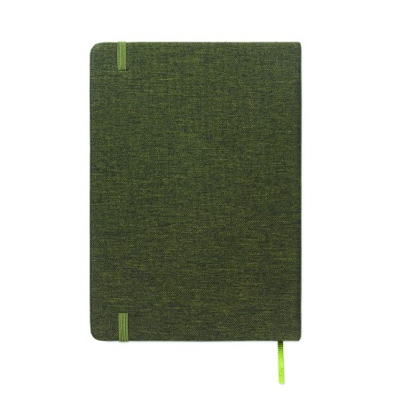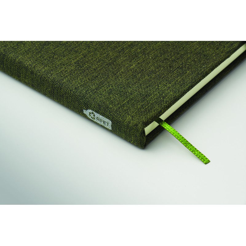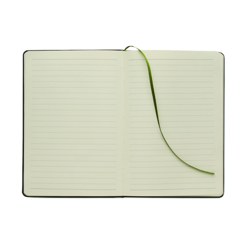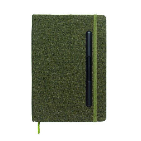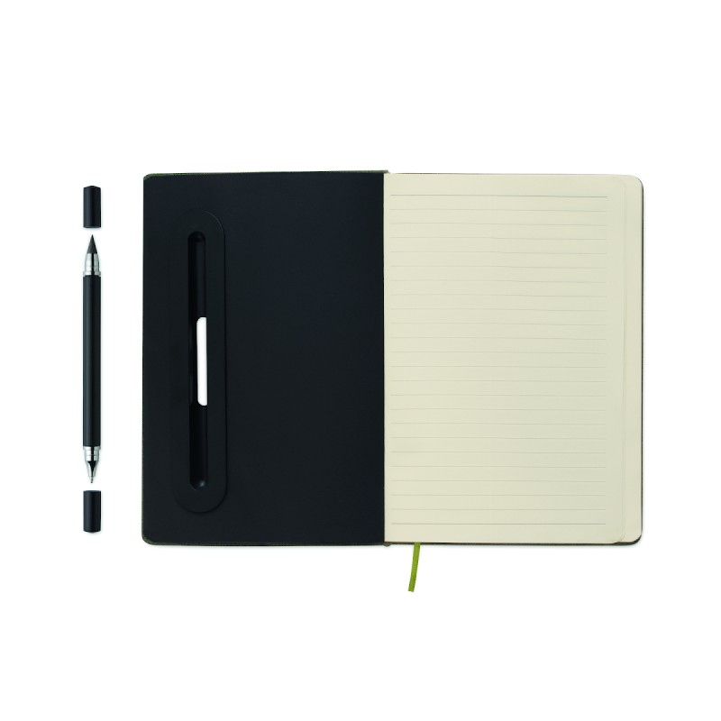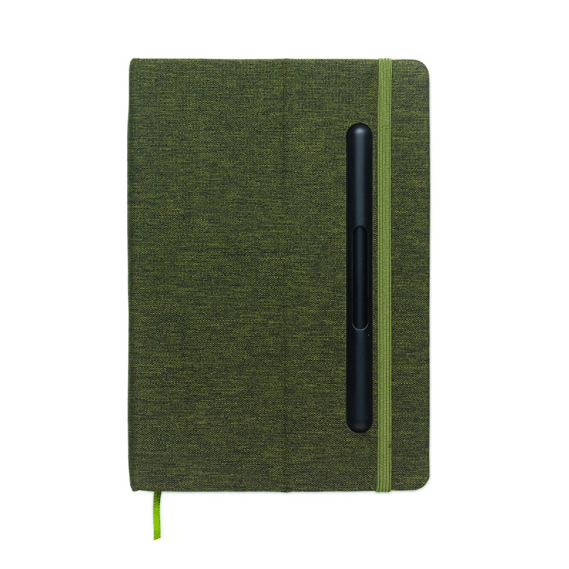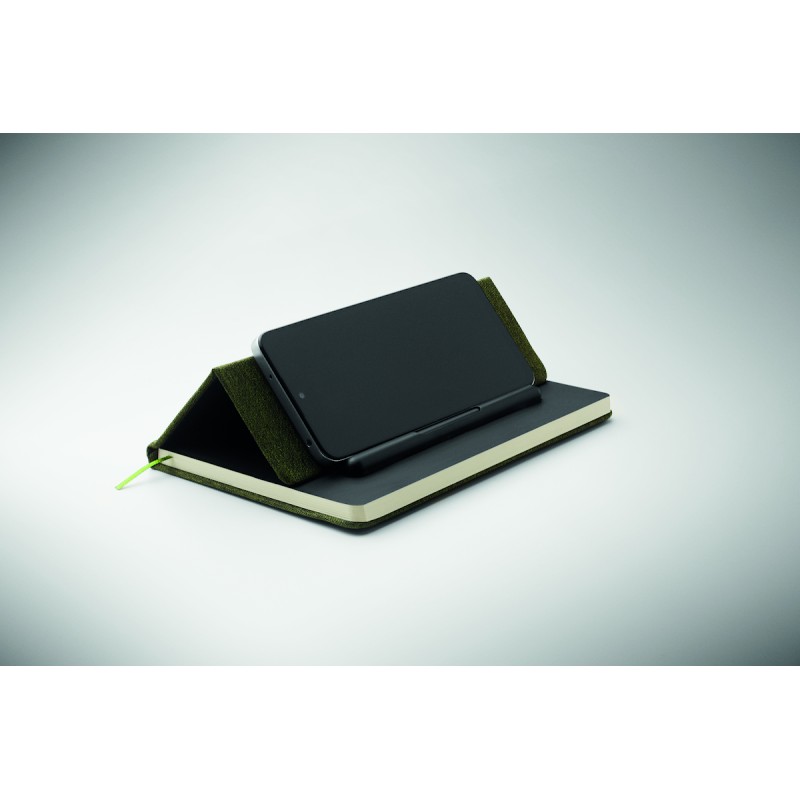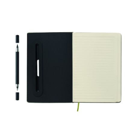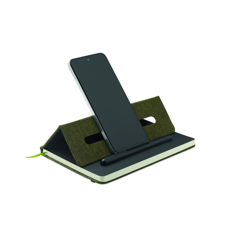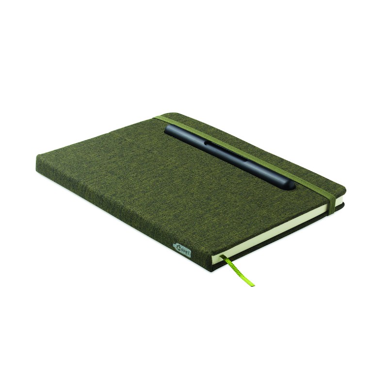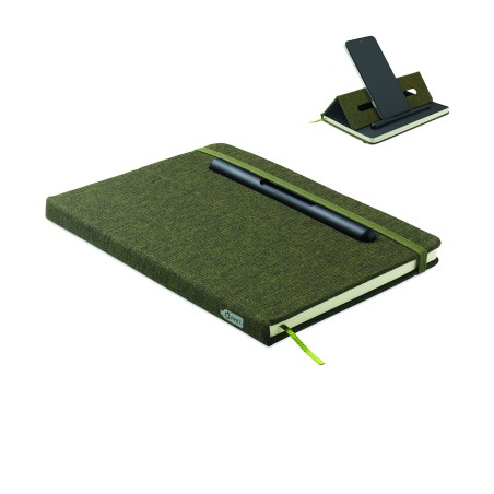 Carnet A5 avec couverture rigide en RPET et fonction support de téléphone. Stylo-bille 2-en-1 intégré en ABS. Reliure dos collé. 192 pages lignées en papier recyclé (96 feuilles). Elastique et marque-page assortis.
