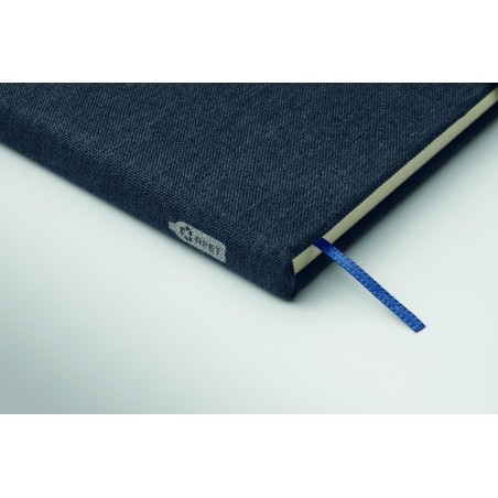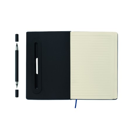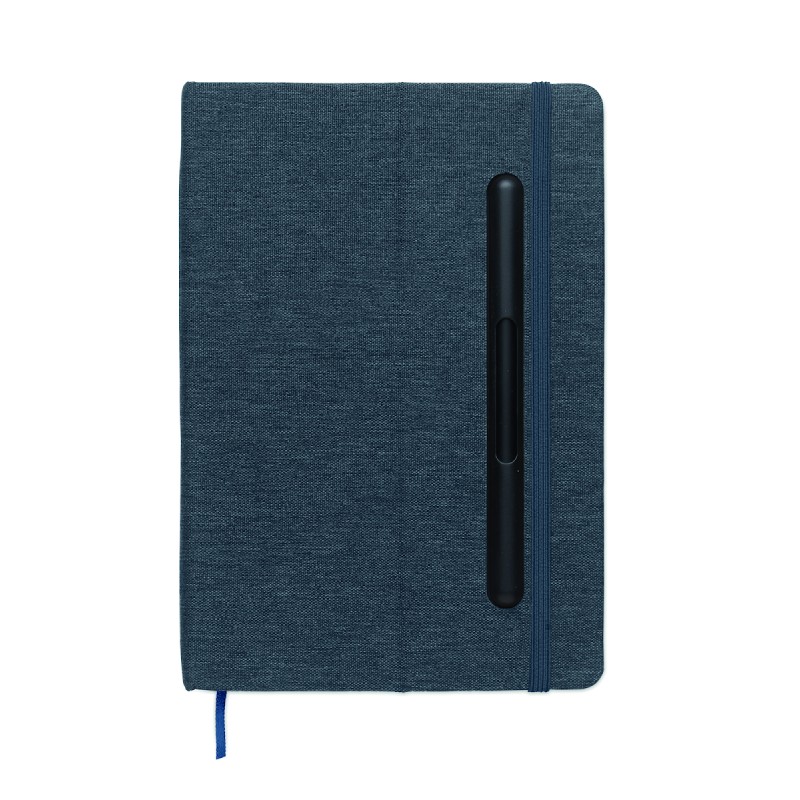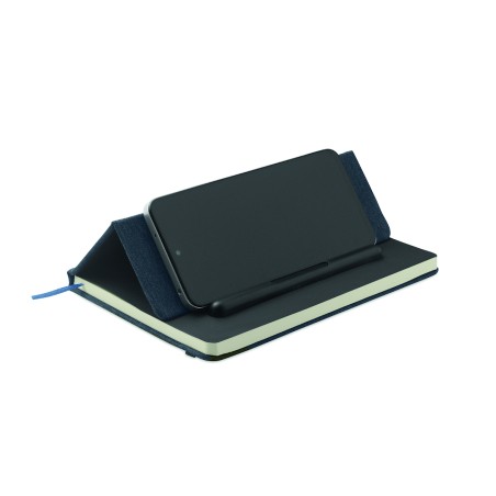 Carnet A5 avec couverture rigide en RPET et fonction support de téléphone. Stylo-bille 2-en-1 intégré en ABS. Reliure dos collé. 192 pages lignées en papier recyclé (96 feuilles). Elastique et marque-page assortis.