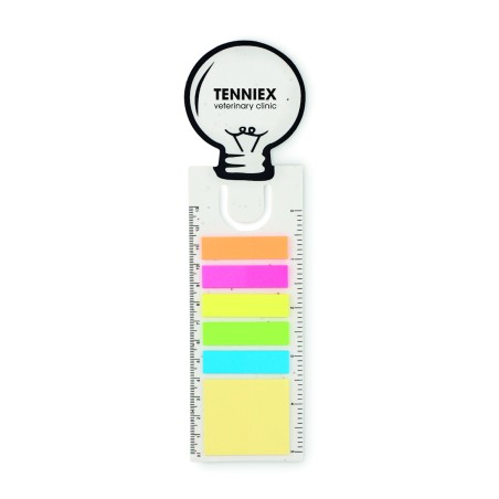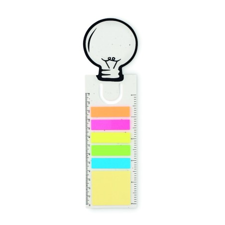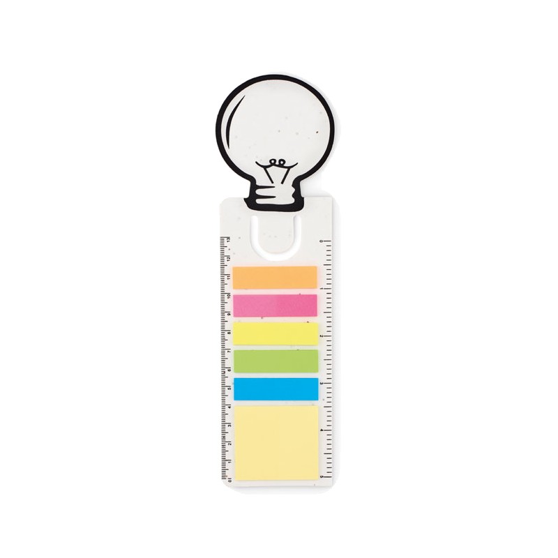 Marque-page en forme d'ampoule en papier semence. Bloc-notes 2 pièces. Bloc de notes autocollantes en papier recyclé jaune moyen et 5 marqueurs de page de couleurs assorties. Règle de 13 cm. Apres usage, plantez la couverture et regardez-la se transformer en un magnifique parterre de coquelicots.