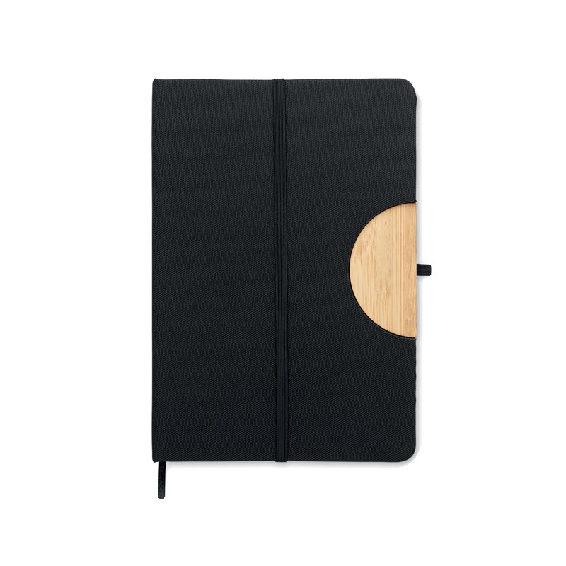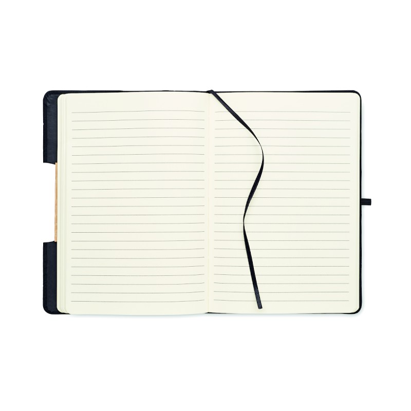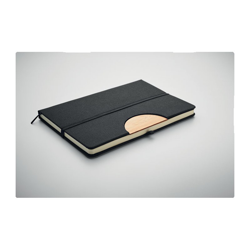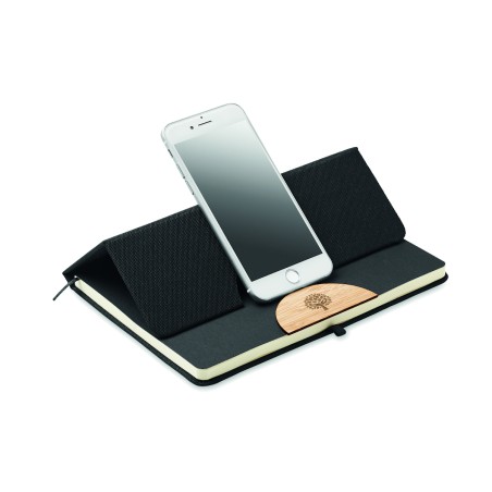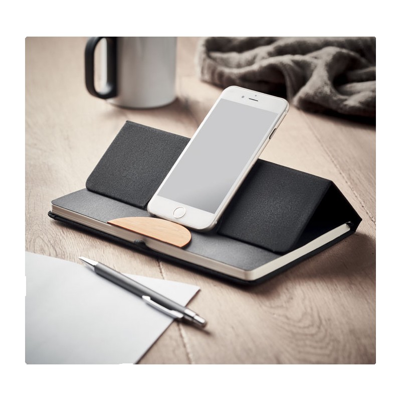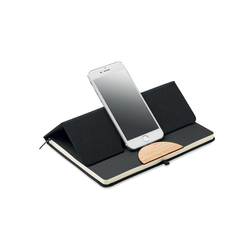 Carnet de notes A5 avec couverture rigide en RPET 600D avec détail en bambou avec une fonction de support pour smartphone. . 160 pages lignées (80 feuilles). Papier recyclé 70 g/m². Sangle de fermeture élastique assortie, marqueur de page en ruban et porte-stylo. Emportez cet indispensable du bureau à votre prochaine réunion. Vous avez une réunion à distance ? Ouvrez le support de téléphone et insérez-y votre appareil pour ne pas avoir à le tenir vous-même. FSC®-certified | FSC MIX CREDIT, P7.1, FSC-C213206