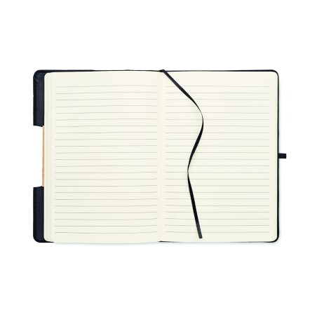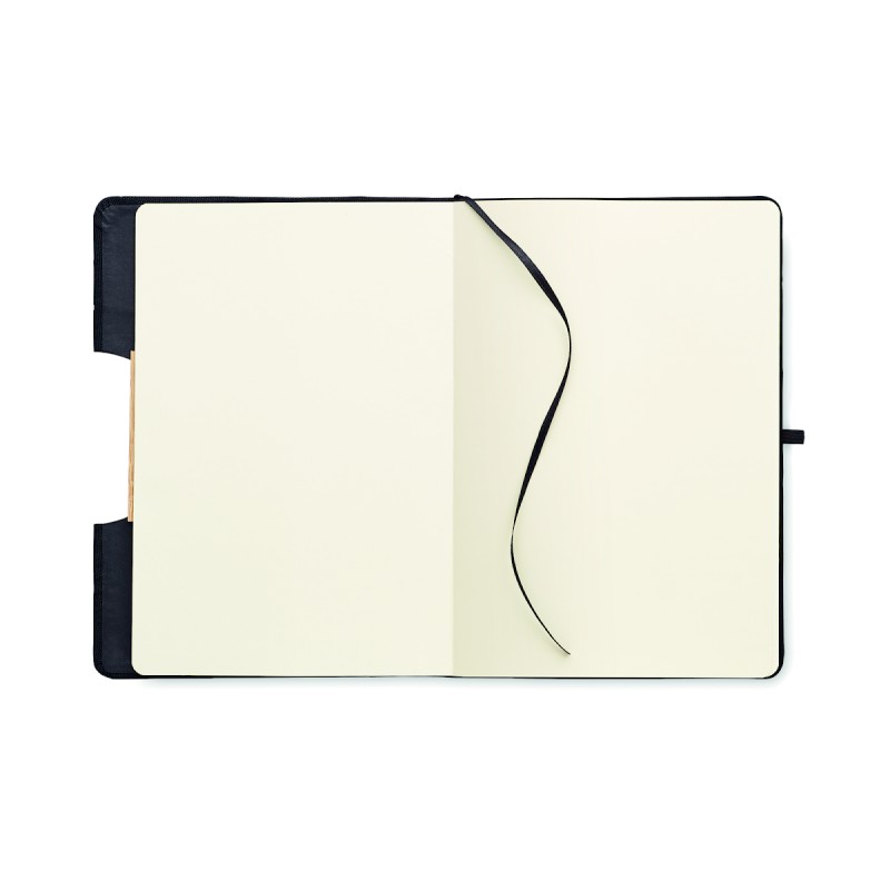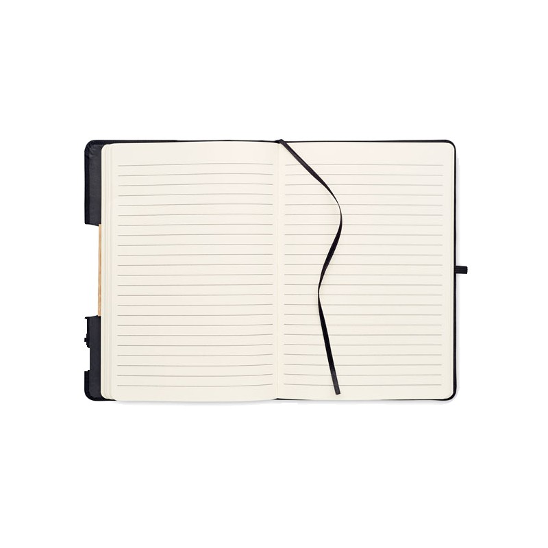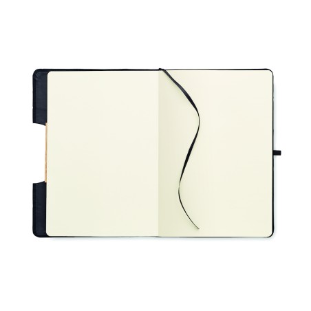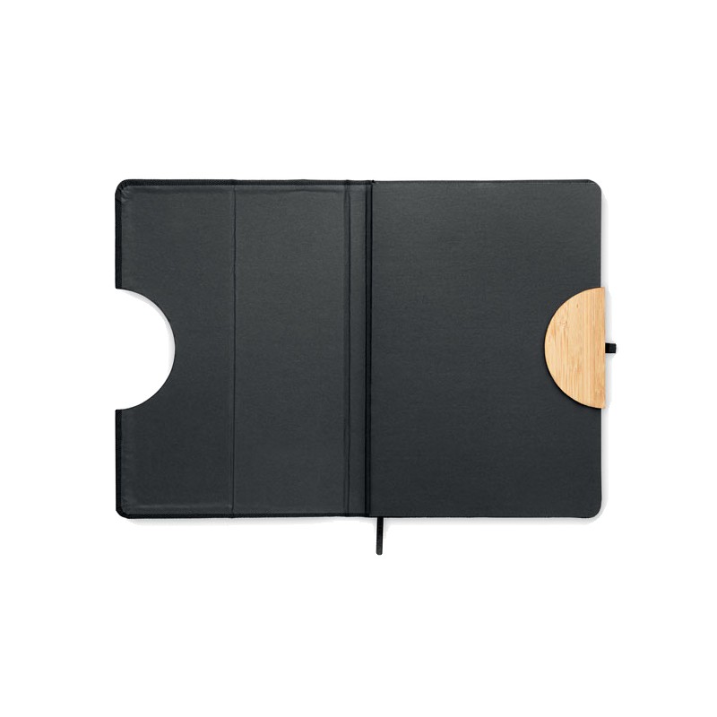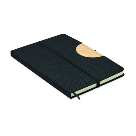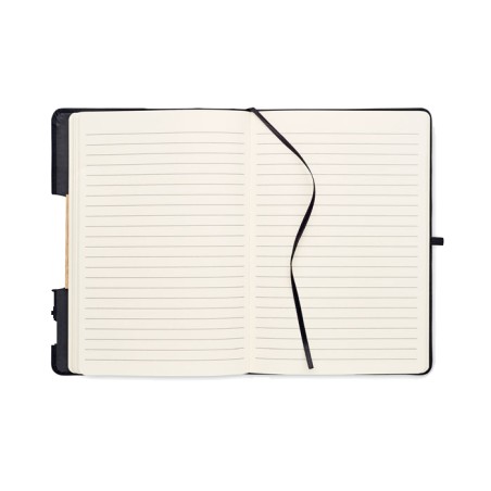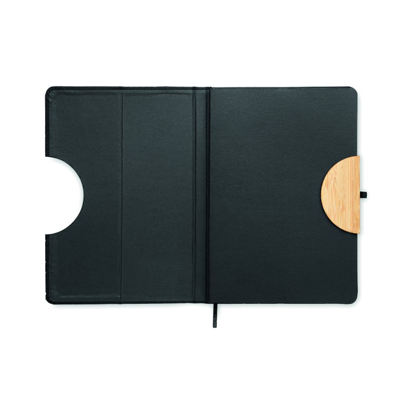 Carnet de notes A5 avec couverture rigide en RPET 600D avec détail en bambou avec une fonction de support pour smartphone. . 160 pages lignées (80 feuilles). Papier recyclé 70 g/m². Sangle de fermeture élastique assortie, marqueur de page en ruban et porte-stylo. Emportez cet indispensable du bureau à votre prochaine réunion. Vous avez une réunion à distance ? Ouvrez le support de téléphone et insérez-y votre appareil pour ne pas avoir à le tenir vous-même. FSC®-certified | FSC MIX CREDIT, P7.1, FSC-C213206