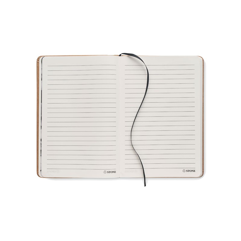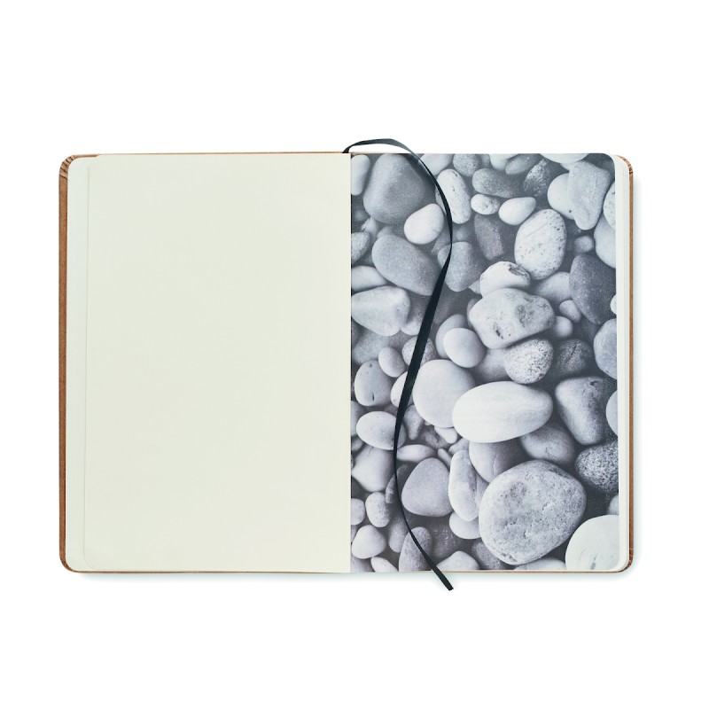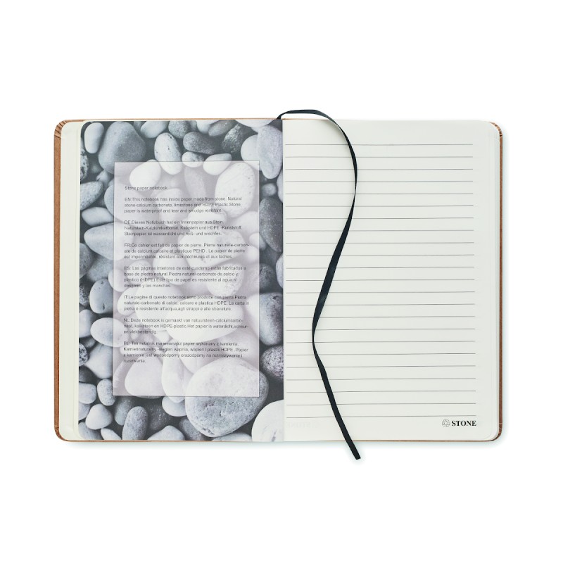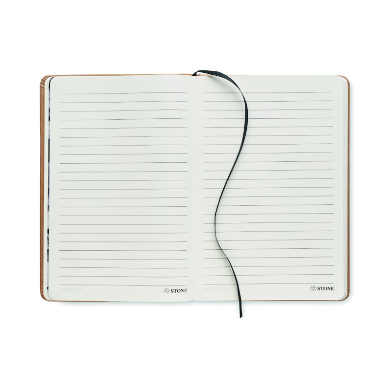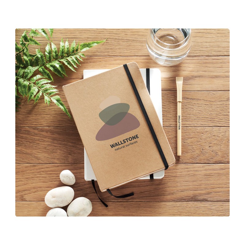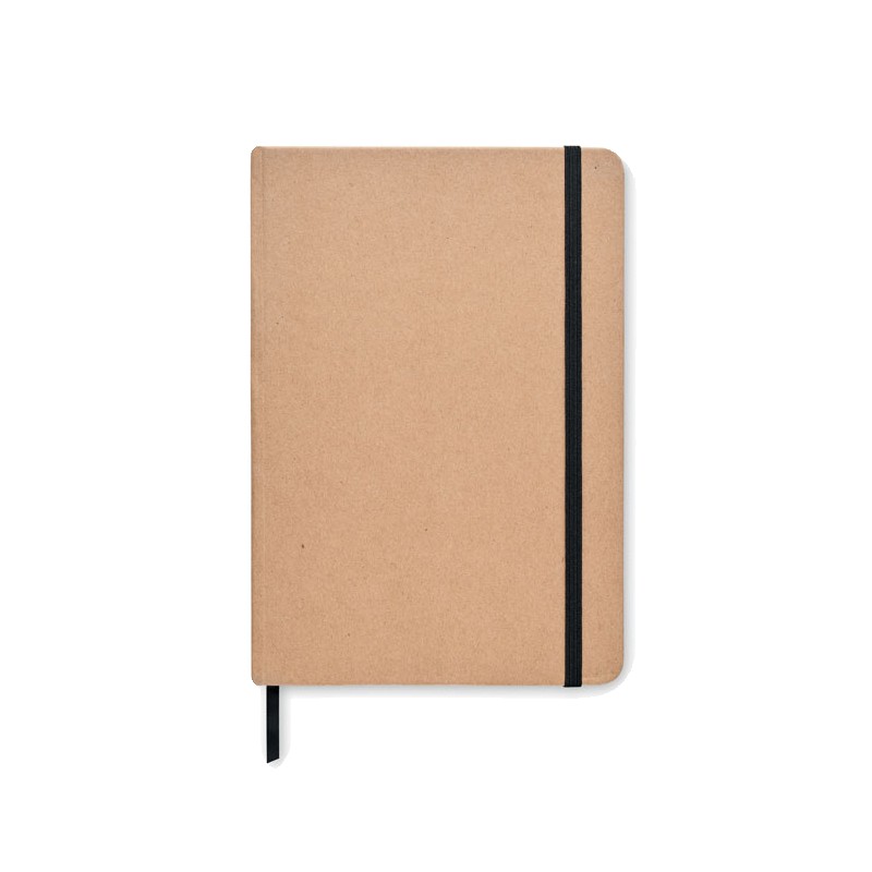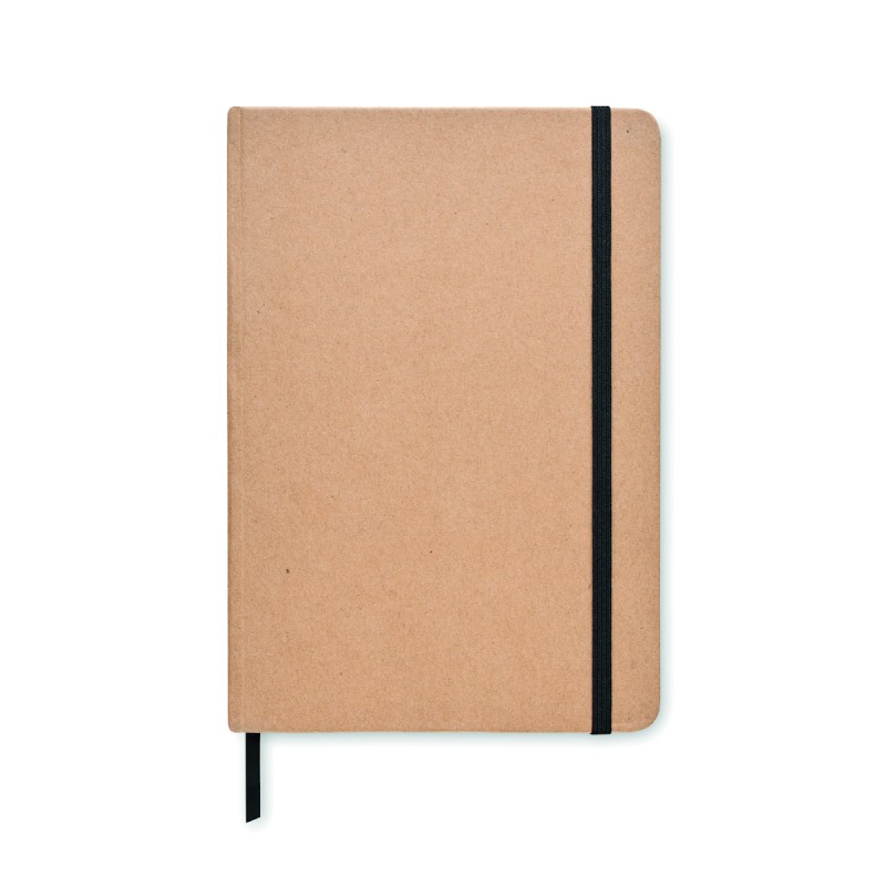 Carnet A5 avec couverture en carton rigide recyclé. 160 pages lignées en papier(80 feuilles) papier minéral. Bande de fermeture élastique et ruban marque- page. FSC®-certified | FSC MIX CREDIT, P7.1 , FSC-C213206