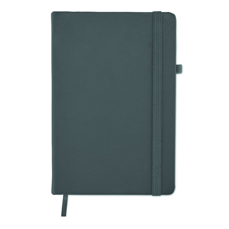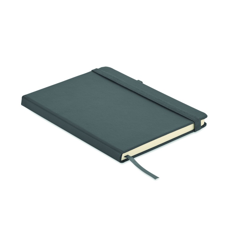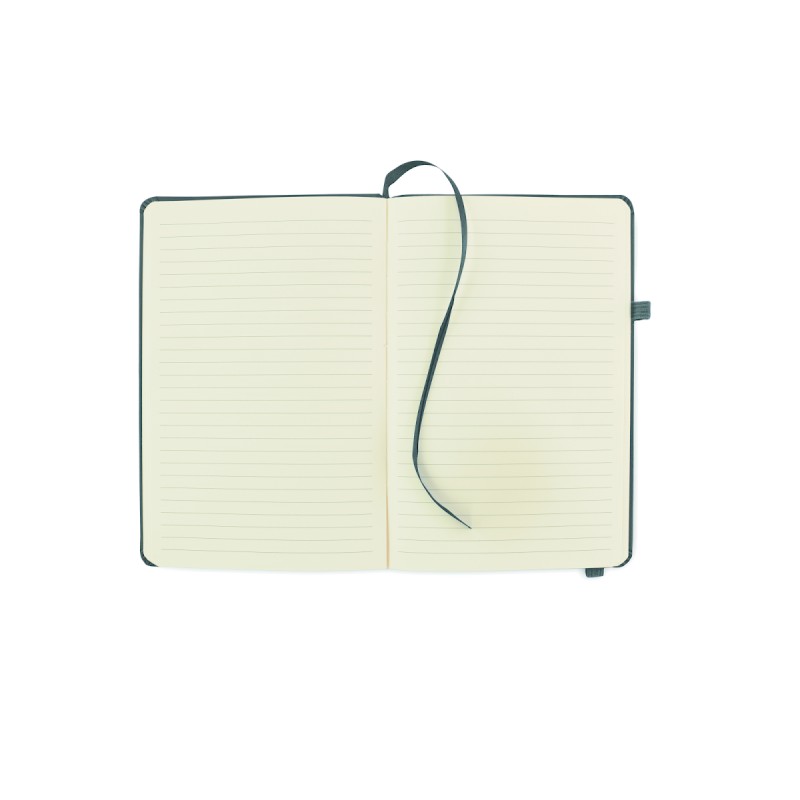 Carnet A5 avec couverture en cuir pré-consommation recyclé à 70 % et en latex PU à 30 %. 192 pages lignées en papier recyclé (96 feuilles). Fermeture élastique en coton et porte-stylo assortis.