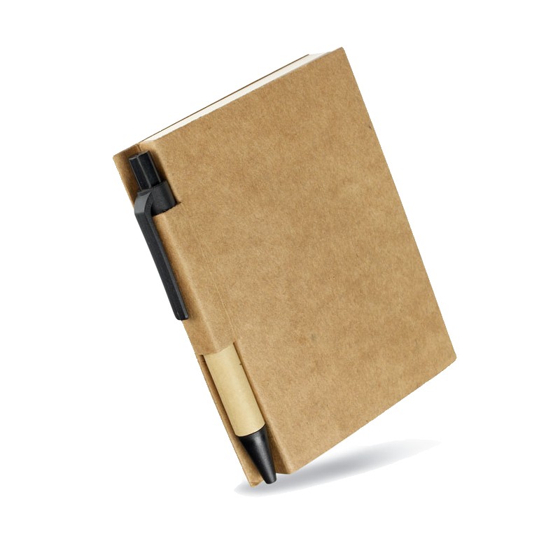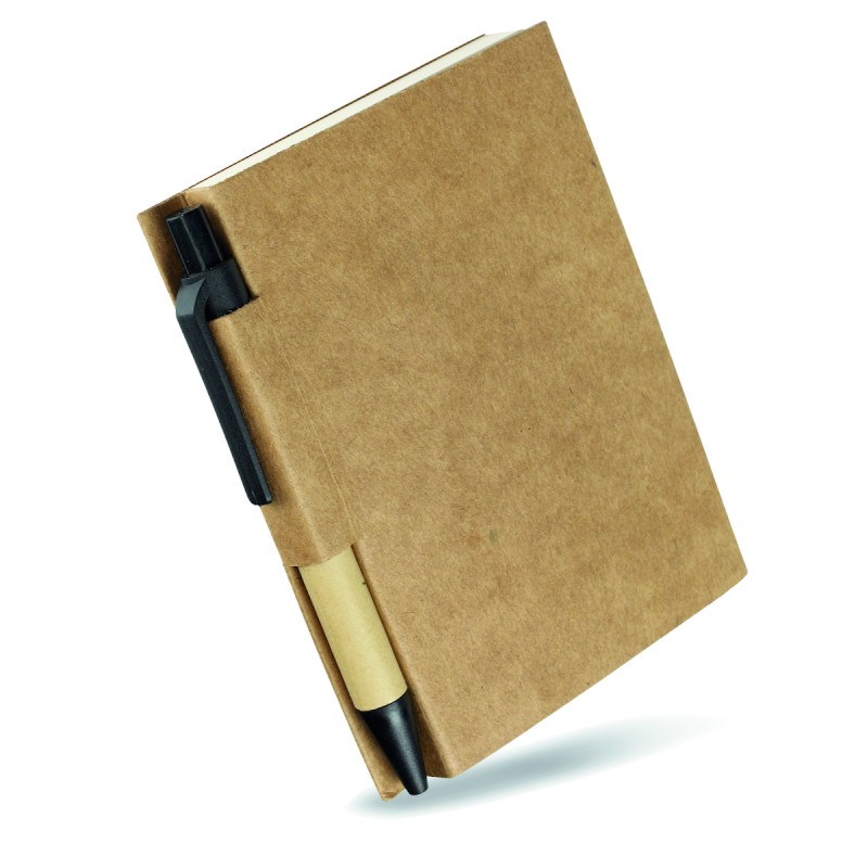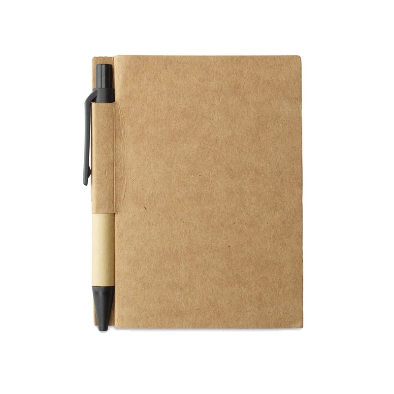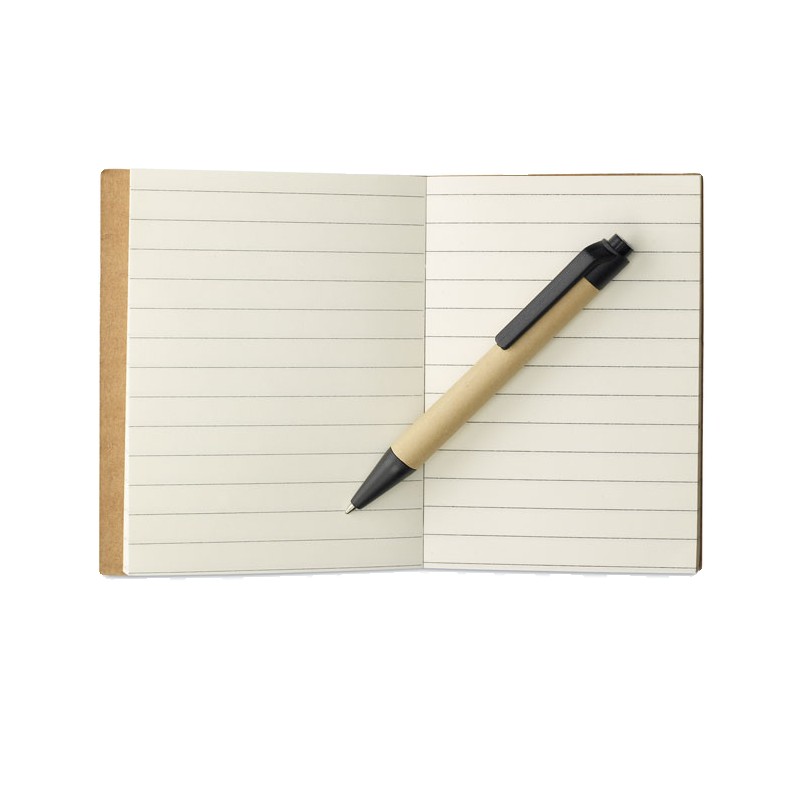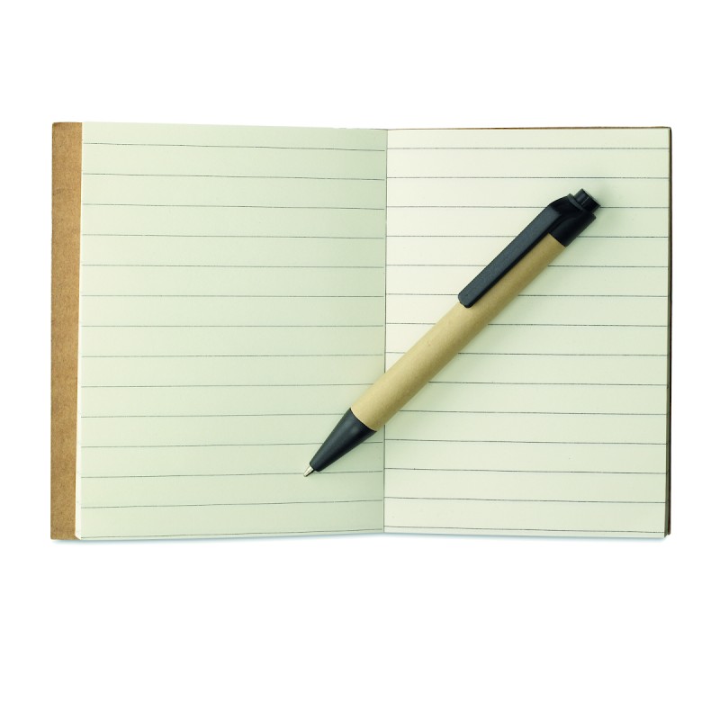 Carnet en papier recyclé avec stylo assorti. Couverture en papier souple avec porte-stylo. 160 pages lignées (80 feuilles). Stylo à bille à bouton poussoir assorti en carton recyclé et plastique biodégradable. Encre bleue. FSC®-certified | FSC MIX, P7.1, FSC-C213206