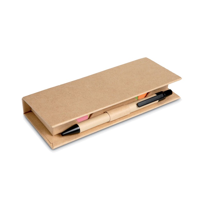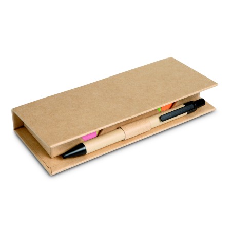 Distributeur en carton recyclé de notes adhésives avec stylo assorti. Blocs de notes autocollantes en papier recyclé de taille moyenne en 2 couleurs et 5 marqueurs de page de couleurs assorties. Stylo à bille assorti avec corps en papier. Encre bleue. Porte-stylo. Pochette avec règle transparente en PP de 12 cm.
