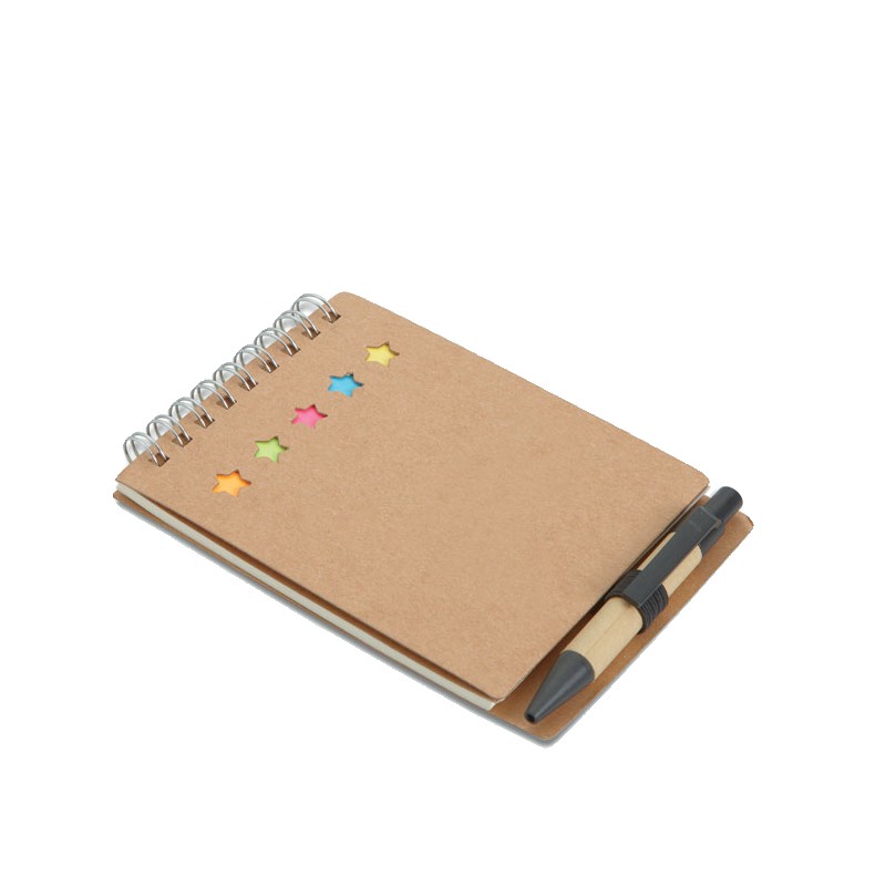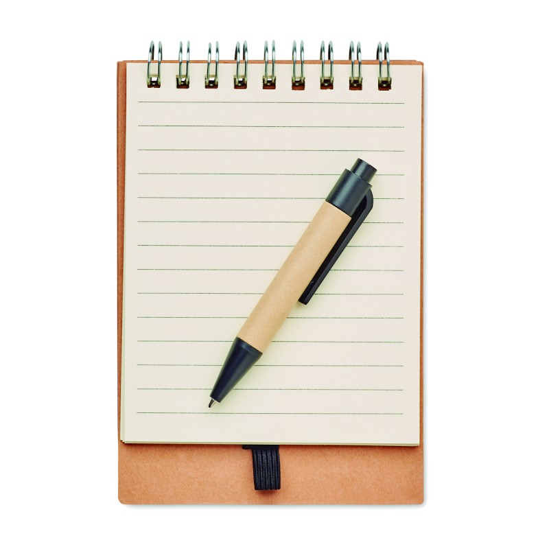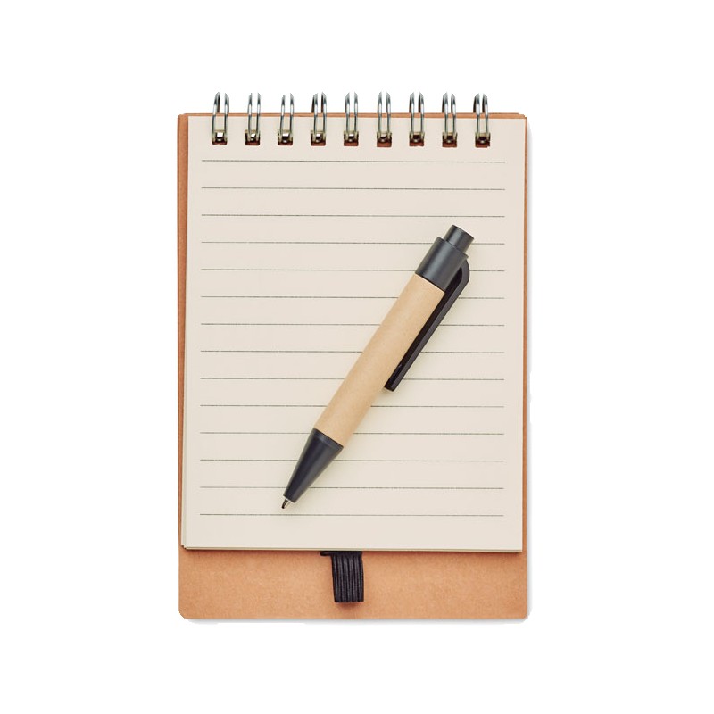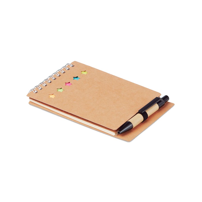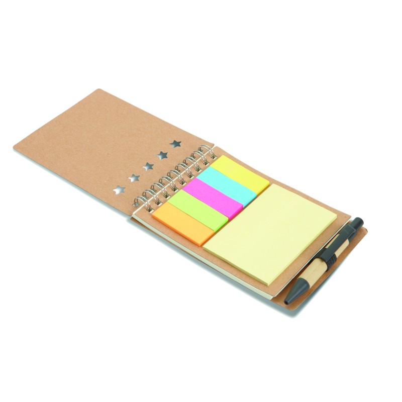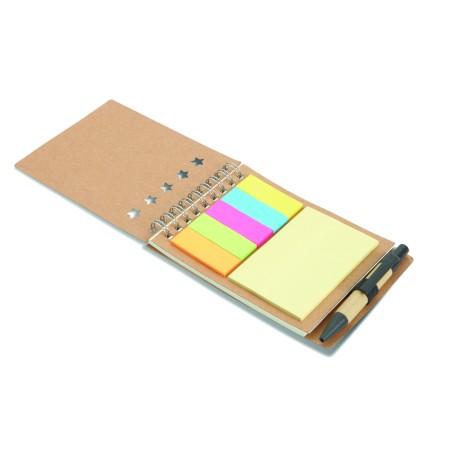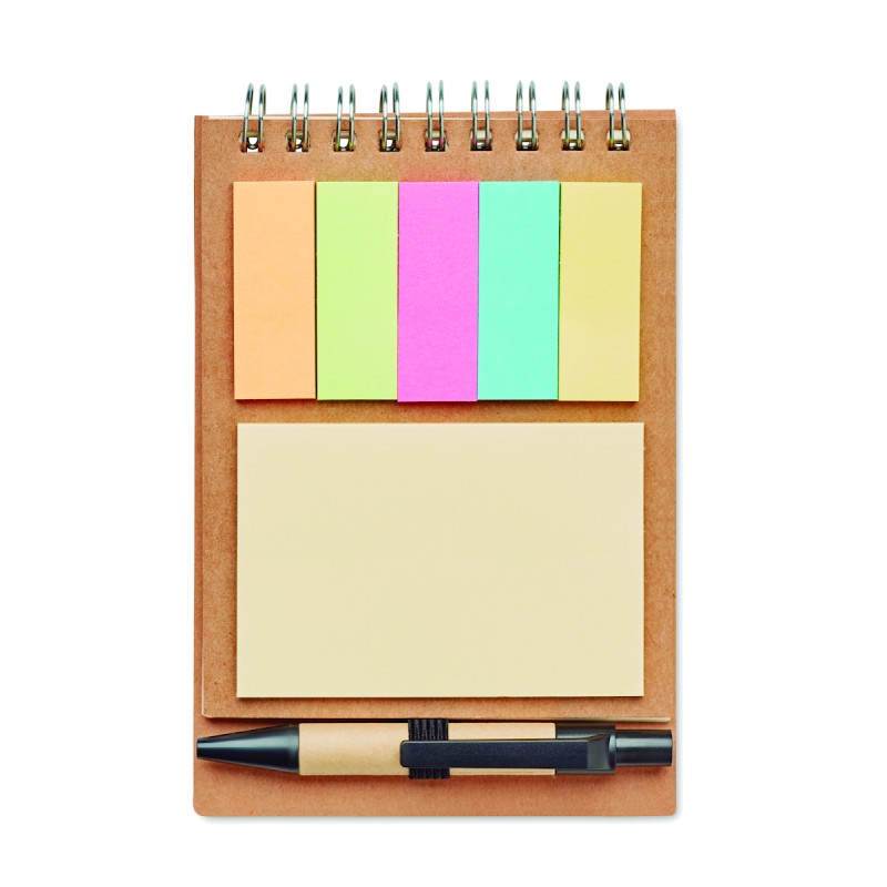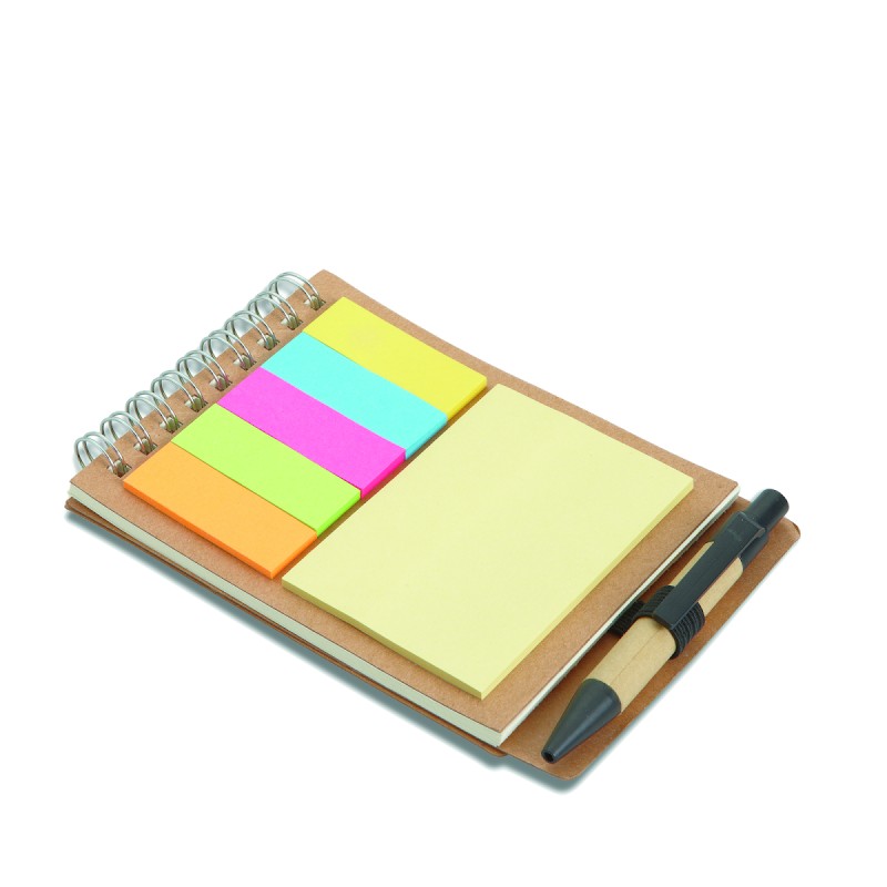 Bloc-notes à spirale en carton recyclé avec stylo et notes adhésives. Couverture souple en papier recyclé. 40 feuilles lignées. Porte-stylo élastique. Blocs de 25 notes adhésives recylées et 5 marqueurs de couleurs assorties. Stylo à bille à bouton poussoir en carton recyclé et plastique biodégradable. Encre bleue. FSC MIX CREDIT | P7.1 | FSC-C213206