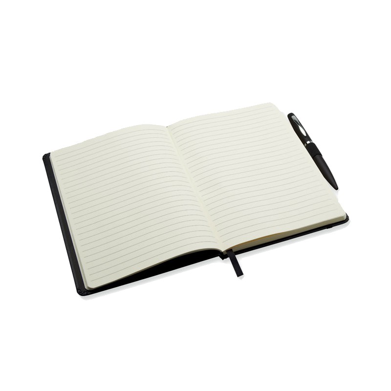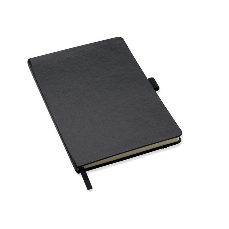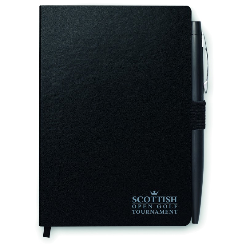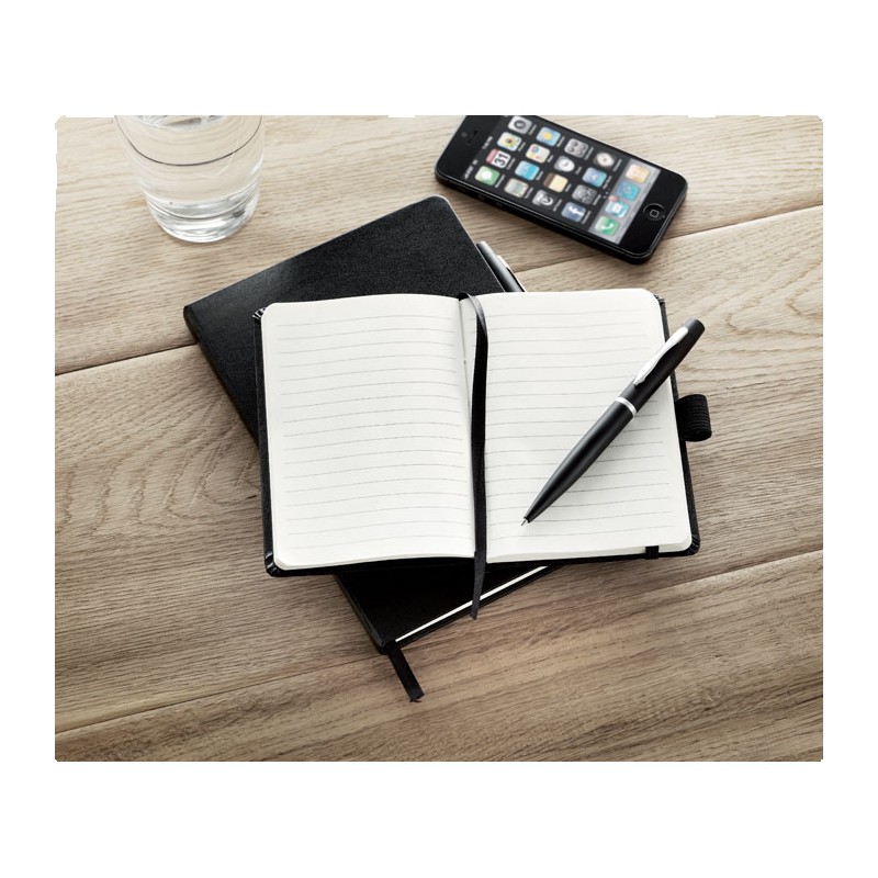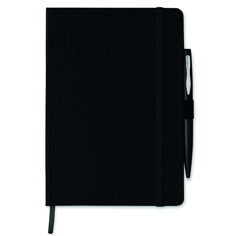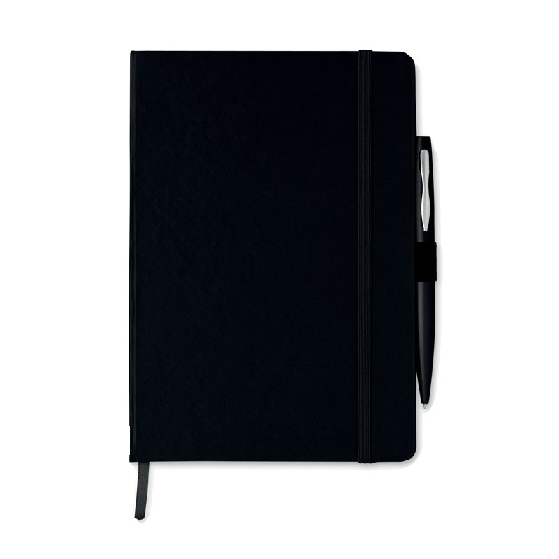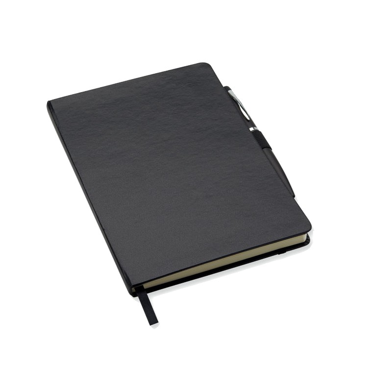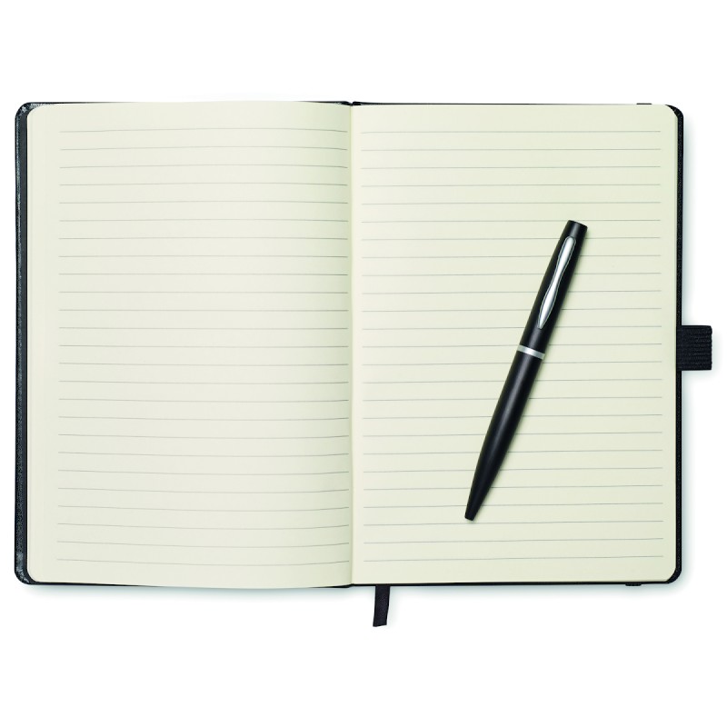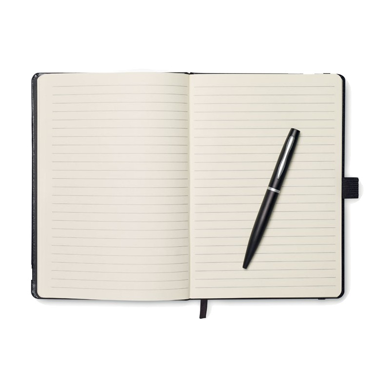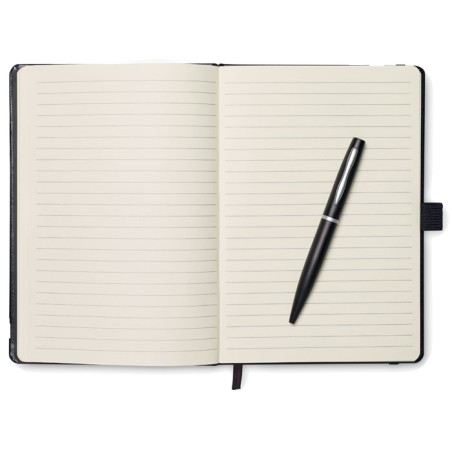 Carnet A5 avec stylo. Couverture rigide en PU. 144 pages lignées (72 feuilles). Bande élastique de fermeture et porte-stylo assortis. Stylo à bille à bouton-poussoir en métal assorti. Encre bleue. FSC MIX CREDIT | P7.1 | FSC-C213206