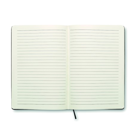 Carnet A5 avec couverture souple en PU. 160 pages lignées (80 feuilles en papier recyclé). Bande élastique de fermeture et marque-page en ruban assortis. Poche intérieure extensible au dos. Porte-stylo sur la tranche.