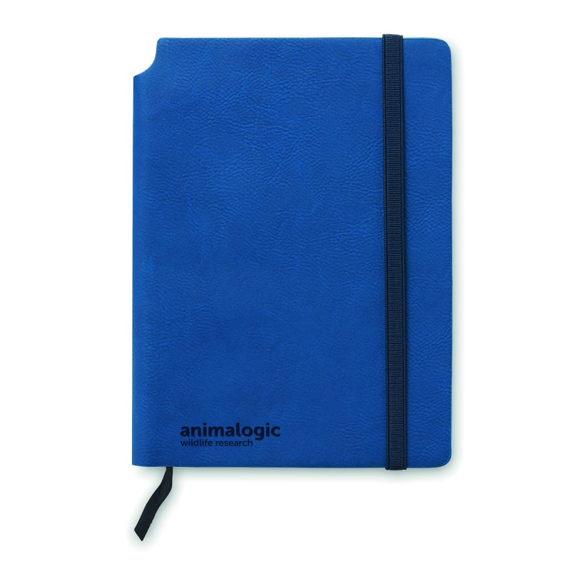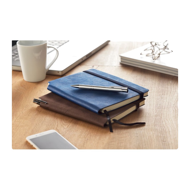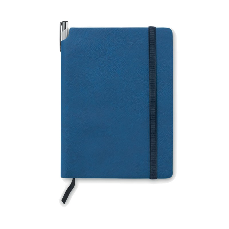 Carnet A5 avec couverture souple en PU. 160 pages lignées (80 feuilles en papier recyclé). Bande élastique de fermeture et marque-page en ruban assortis. Poche intérieure extensible au dos. Porte-stylo sur la tranche.