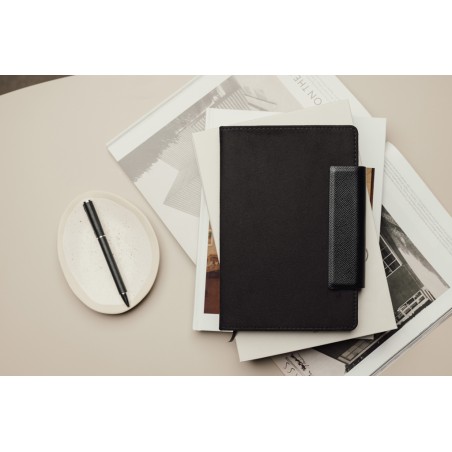 Un élégant carnet A5 composé de 160 pages lignées (80 feuilles). C'est l'accessoire idéal à emporter en réunion pour organiser vos notes avec style. Le carnet Marlow combine un design intemporel avec du faux cuir recyclé, des détails en PU et du papier recyclé. Le carnet est équipé d'une fermeture magnétique pratique et élégante. Certifié par GRS (Global Recycled Standard), la certification GRS garantit que l'ensemble de la chaîne d'approvisionnement des matériaux recyclés est certifiée. Ce produit contient 50 % de papier recyclé certifié GRS et 6 % de polyester recyclé certifié GRS.