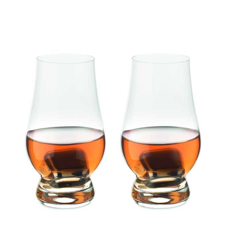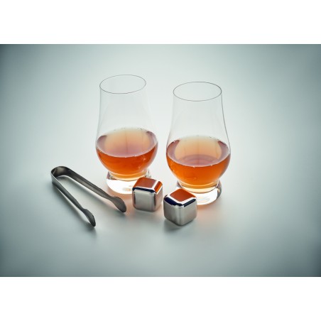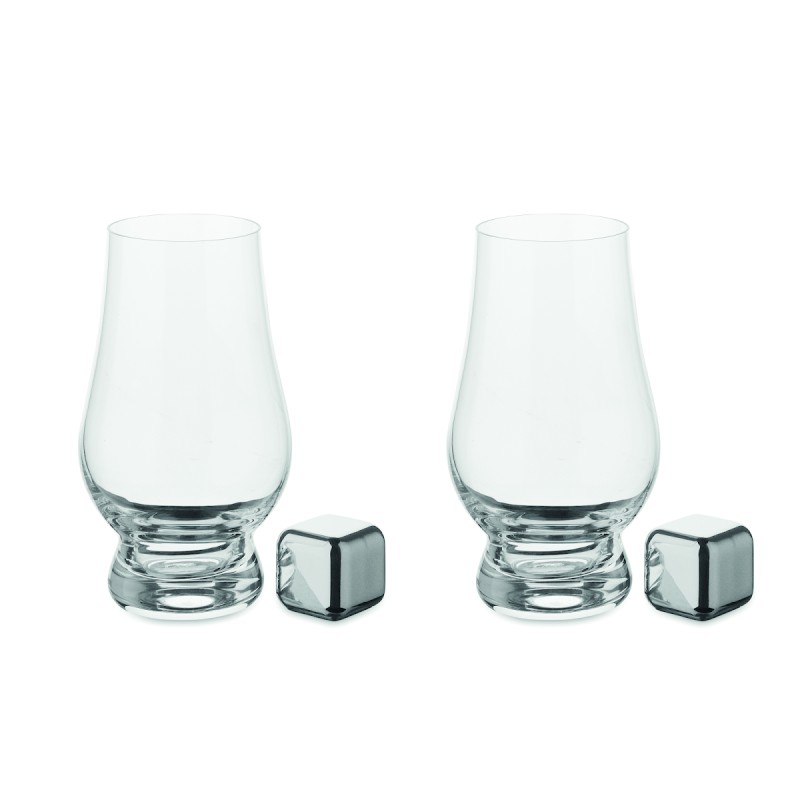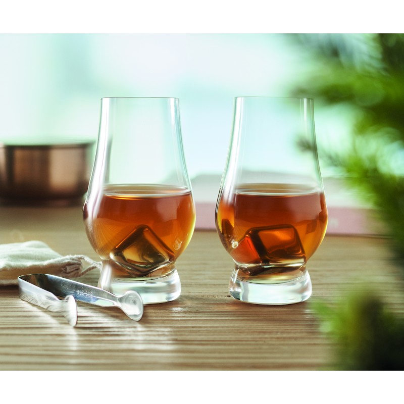 Set de 2 verres de dégustation (200ml) pour whisky ou autres liqueurs, 2 glaçons réutilisables en acier inoxydable, une pince et une pochette en coton pour ranger les glaçons.