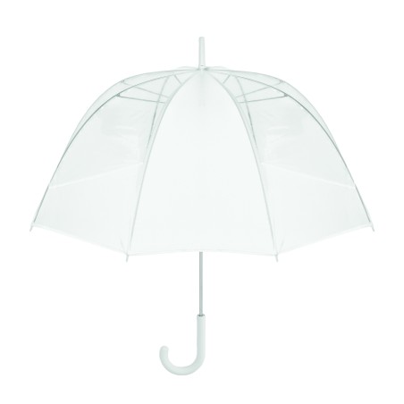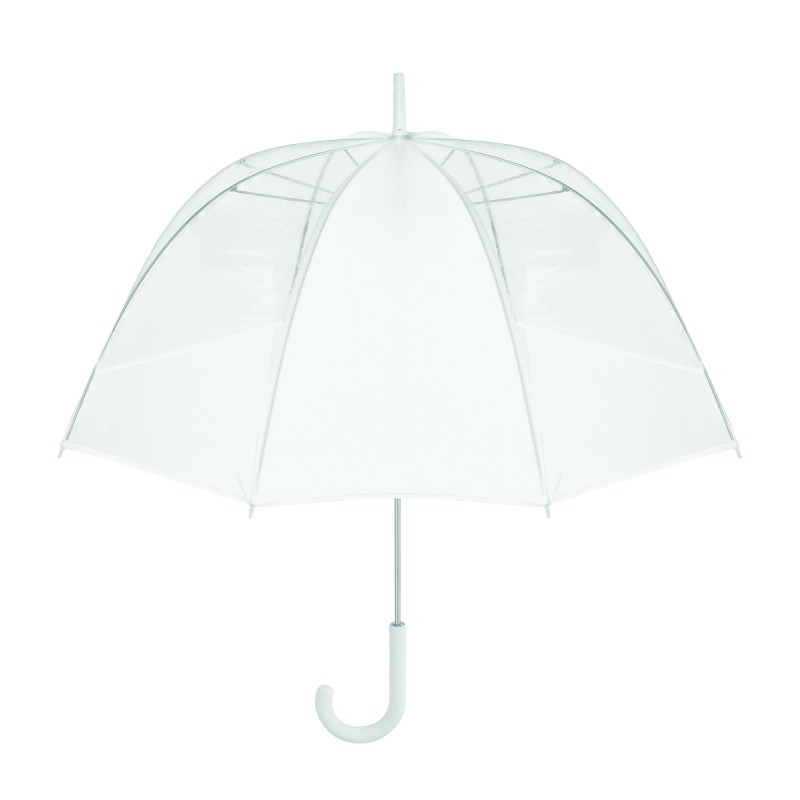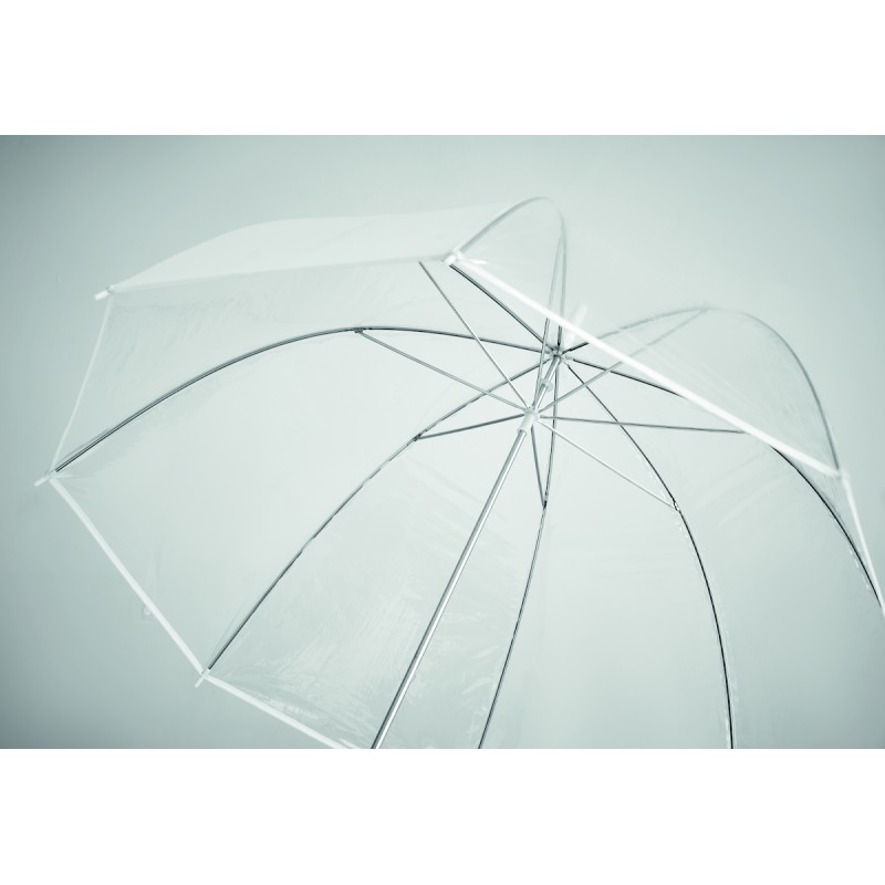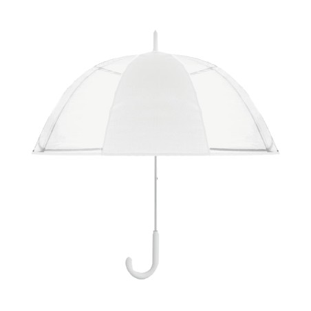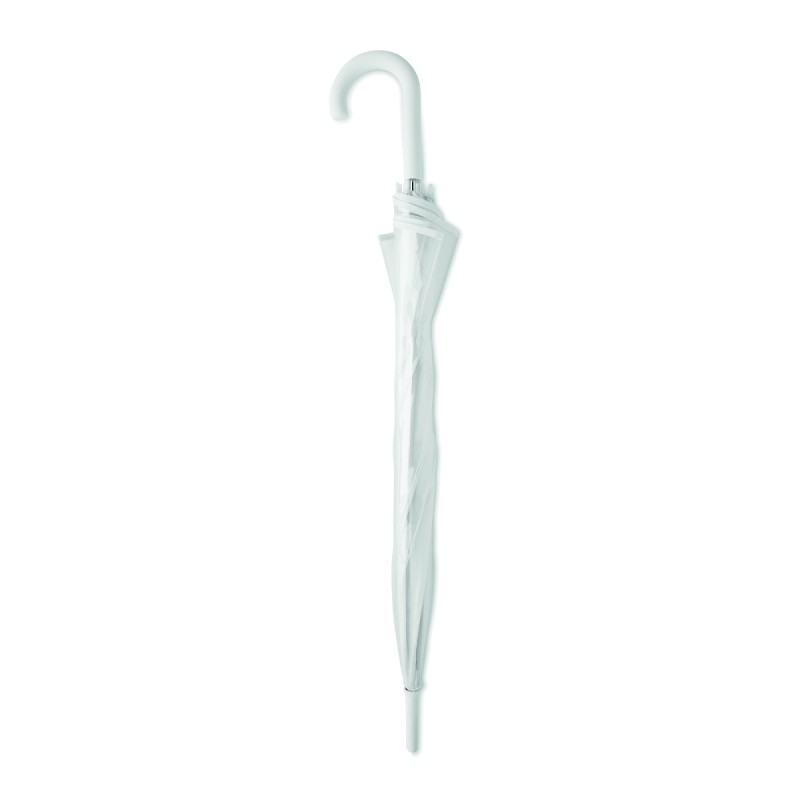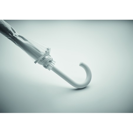 Parapluie droit 23 pouces en POE avec passepoil PG et 1 pan en polyester pour la zone d'impression. Ouverture manuelle. Fibre de verre, baleines et mât. Manche chromé avec embouts en plastique. Poignée en caoutchouc.