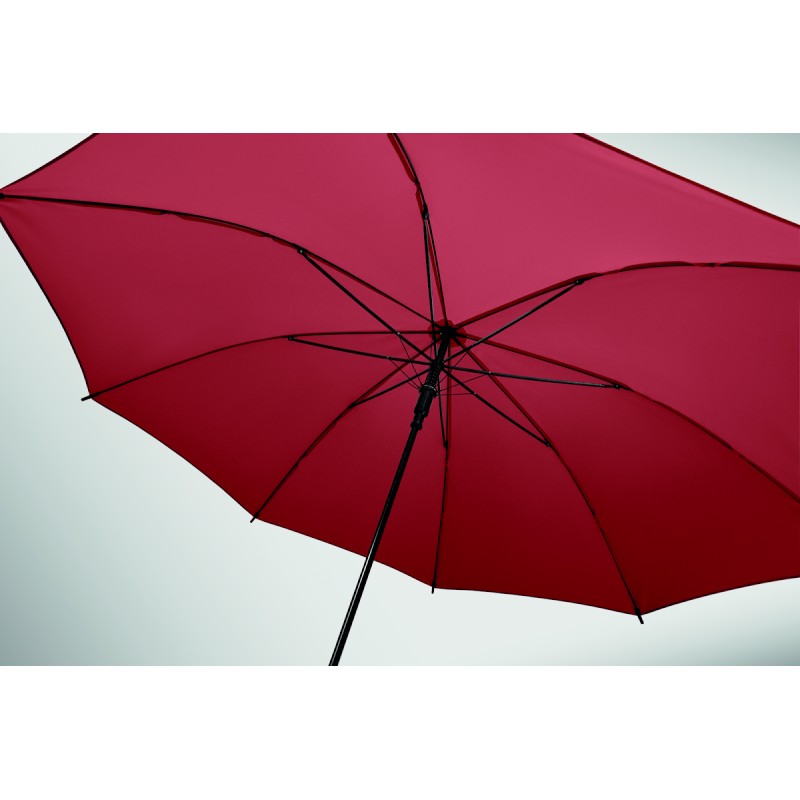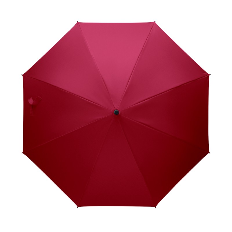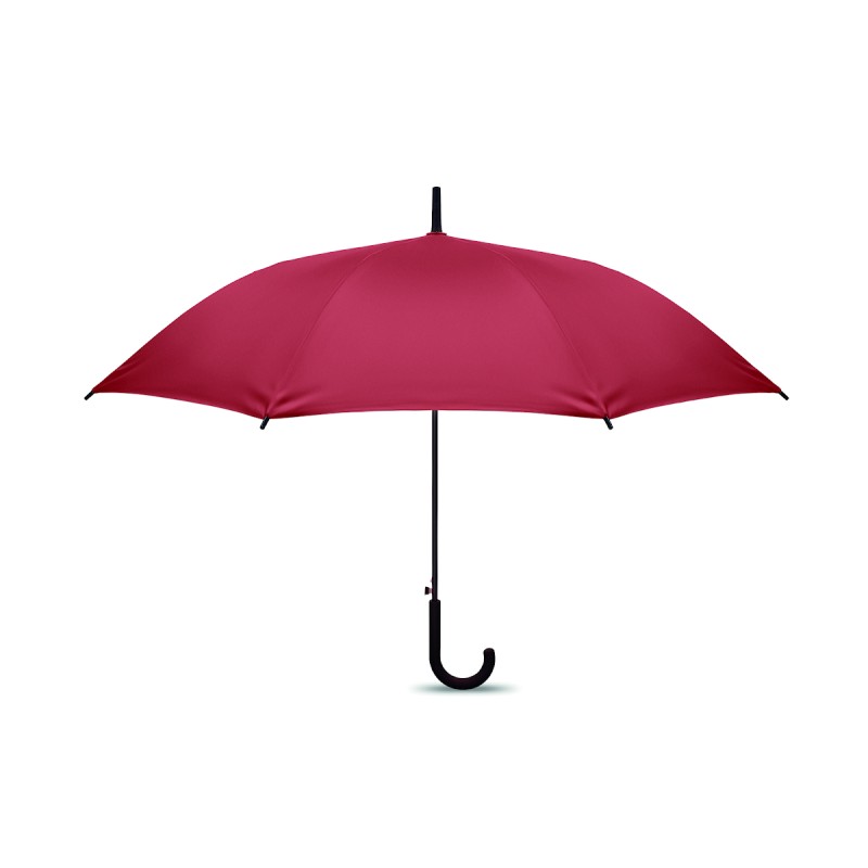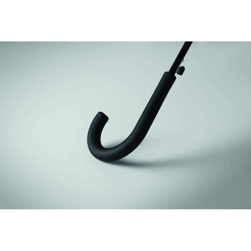 Parapluie droit 23 pouces avec armature en métal plaqué noir, baleines en fibre de verre et panneaux en tissu pongé 190T. Embouts et pointe en plastique. Poignée courbe en plastique PP caoutchouté. Ouverture automatique et fermeture manuelle.