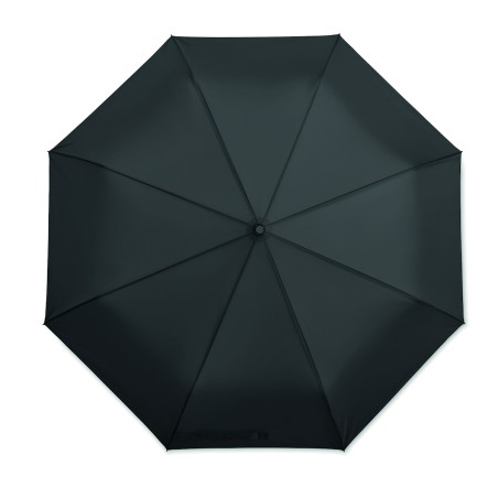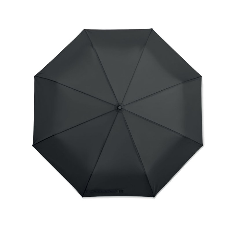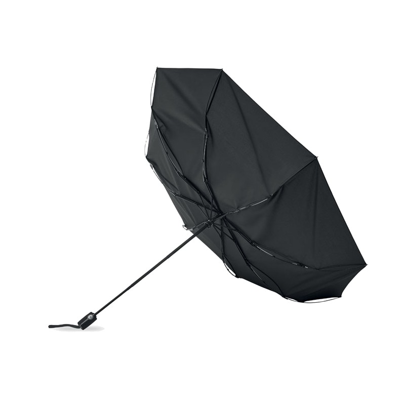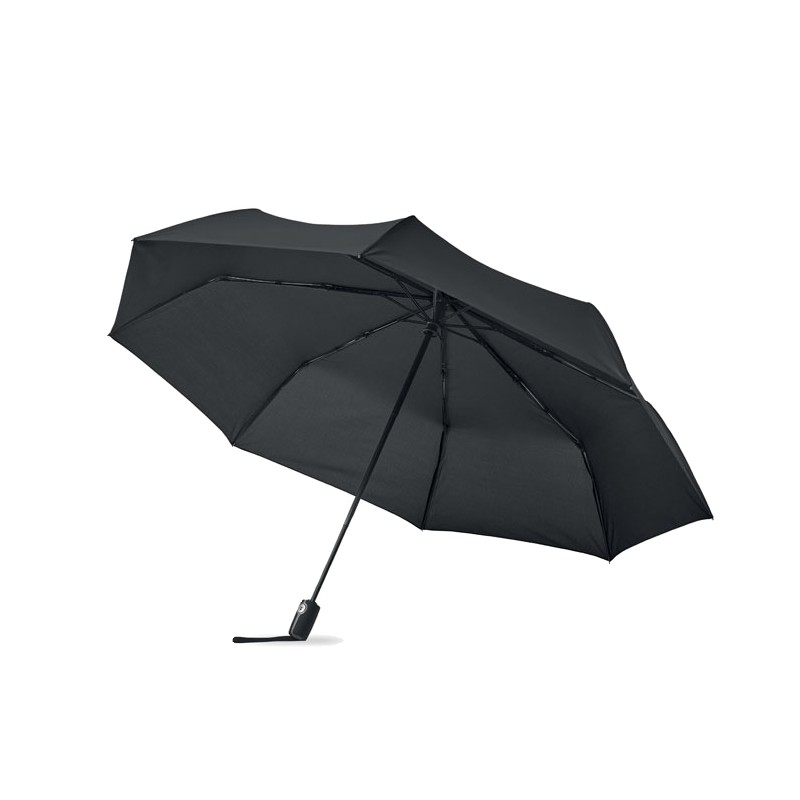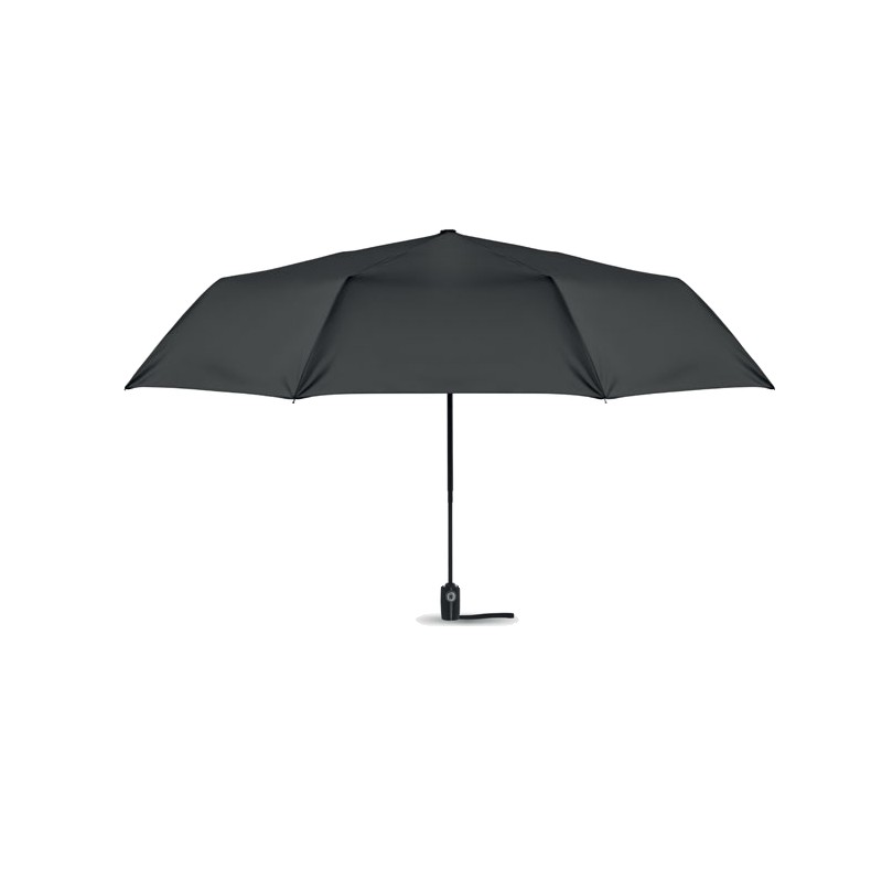 Parapluie tempête de 27 pouces, 3 plis, ouverture/fermeture automatique. Tissu en pongé 190T, mât en acier plaqué noir. Baleines en fibre de verre, revêtement intérieur noir en 1 partie. Poignée en PP noir avec bouton. Avec pochette assortie.