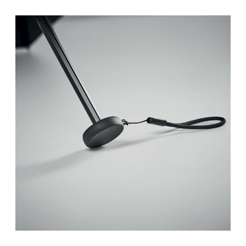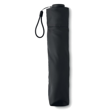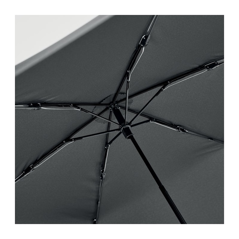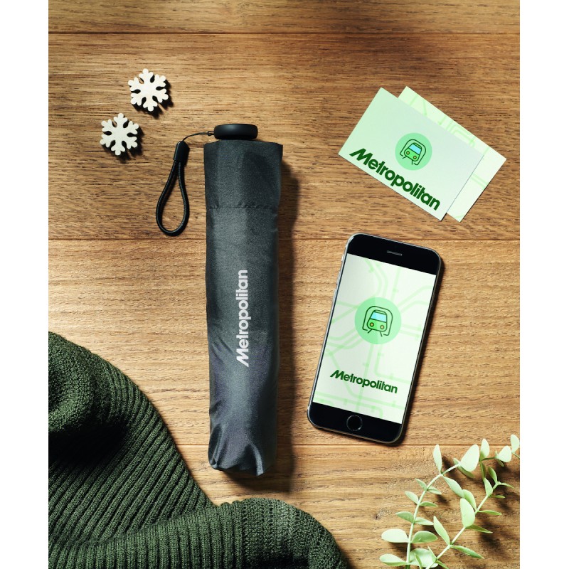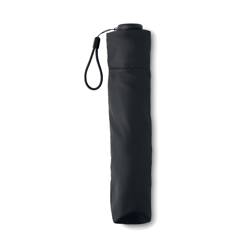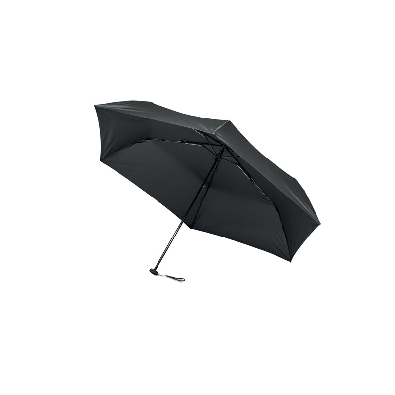 Mini parapluie tempête 3 plis de 19'' à ouverture et fermeture manuelle en polyester pongé 30D. Mât et baleines en fibre de carbone noire et embouts en plastique. Présenté dans une pochette. 100 gr.