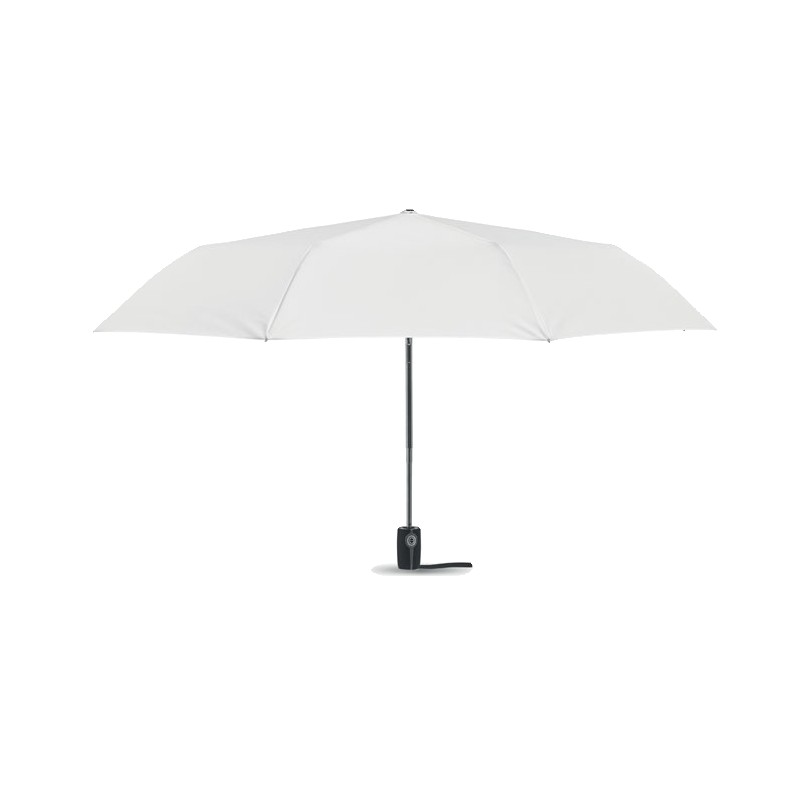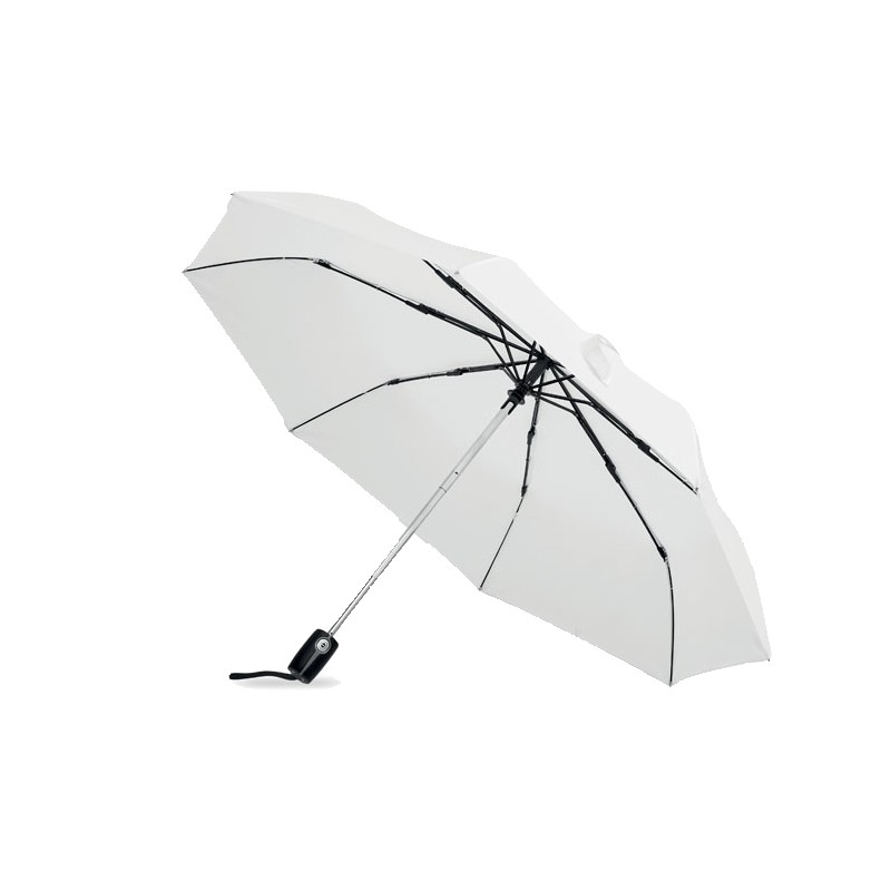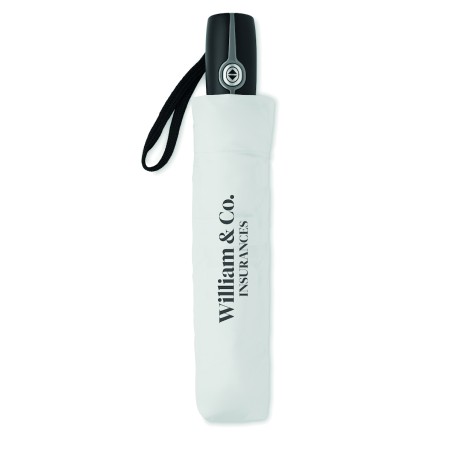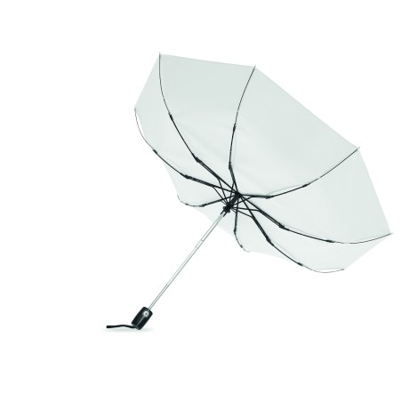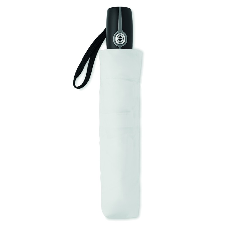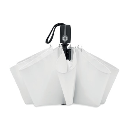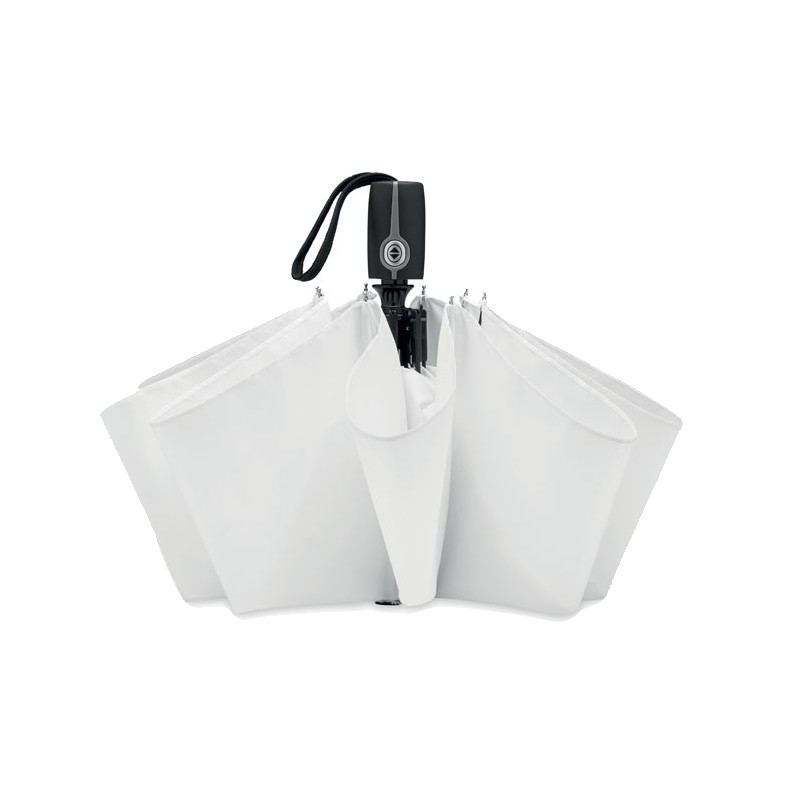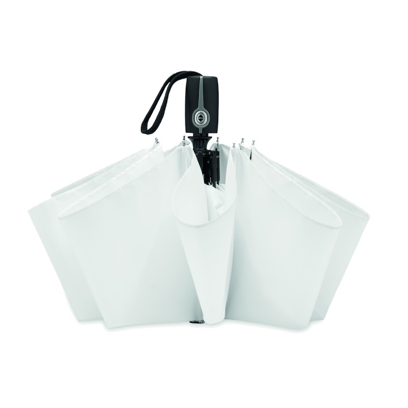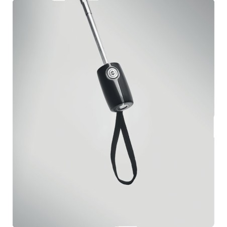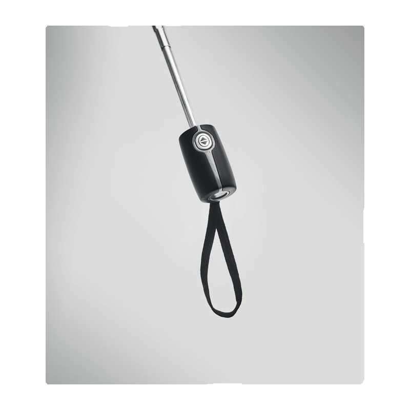Parapluie de tempête ouverture et fermeture auto en pongee 190T . Mât en métal plaqué, baleines en fibre de verre et embouts en métal chromé, poignée en caoutchouc noir avec un Dominga. 3 sections. Housse assortie. Diam: 97 cm. Long. mât : 52,5 cm