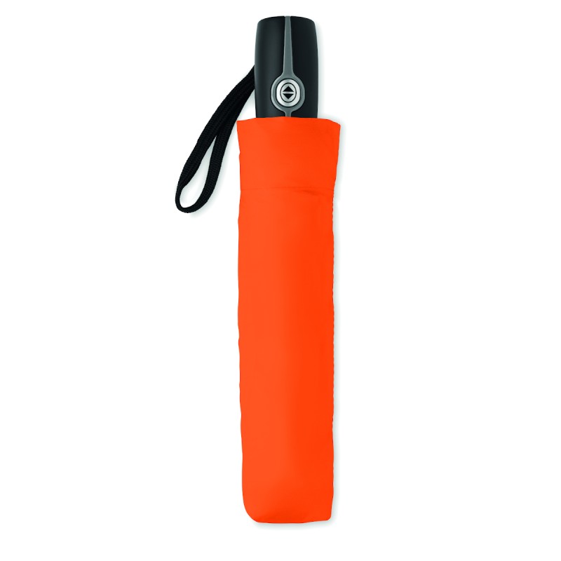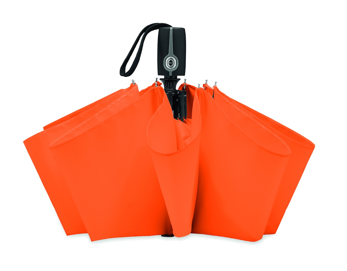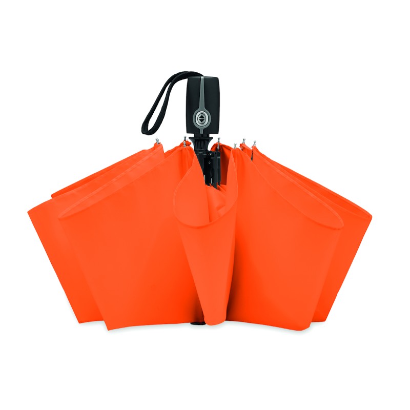Parapluie de tempête ouverture et fermeture auto en pongee 190T . Mât en métal plaqué, baleines en fibre de verre et embouts en métal chromé, poignée en caoutchouc noir avec un Dominga. 3 sections. Housse assortie. Diam: 97 cm. Long. mât : 52,5 cm