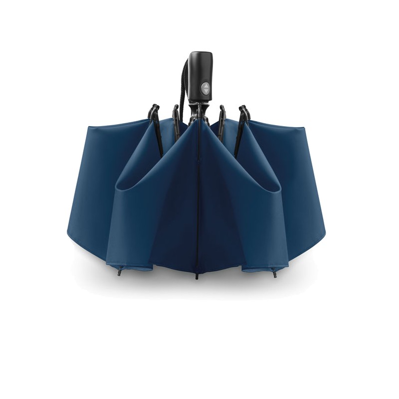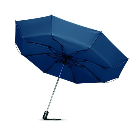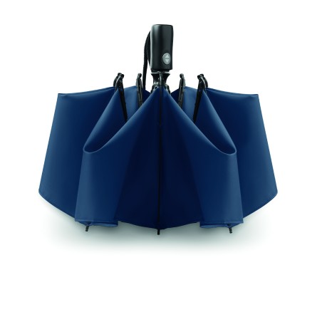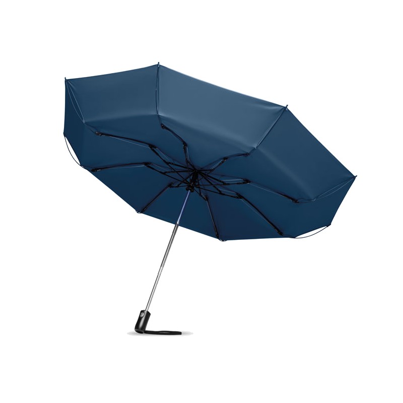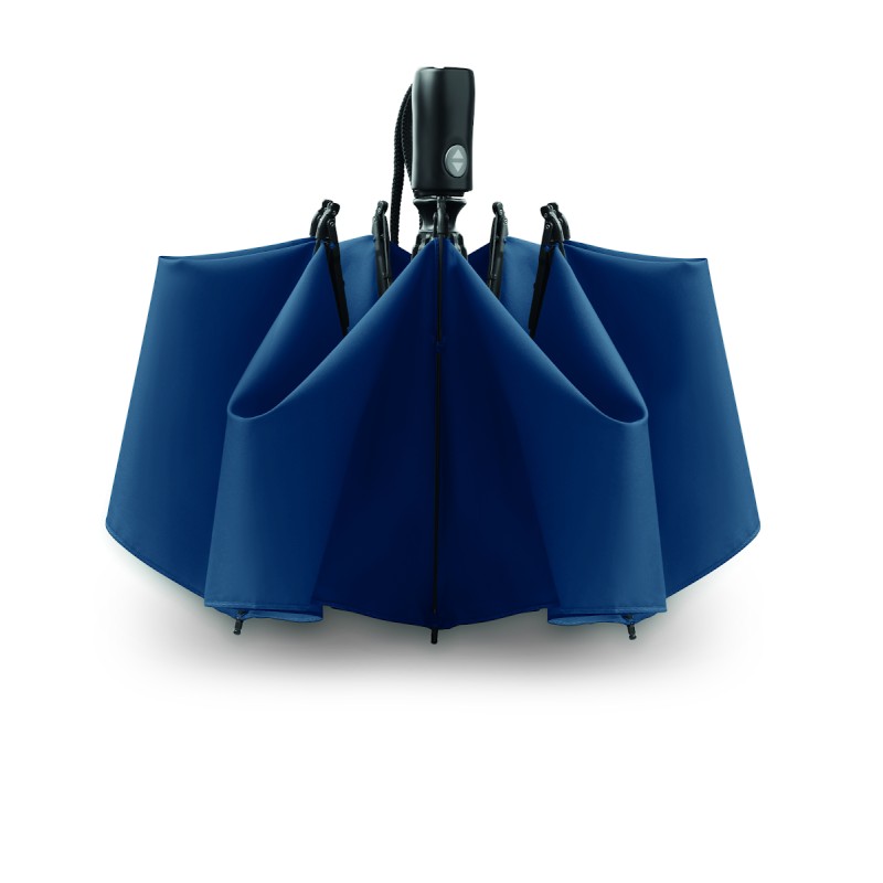 Parapluie 23’’ réversible ouverture/fermeture auto 3 plis en pongé 190T. Mât en acier chromé. Baleines en fibre de verre. Revêtement intérieur noir 1 morceau. Poignée ABS bouton. Pochette assortie.