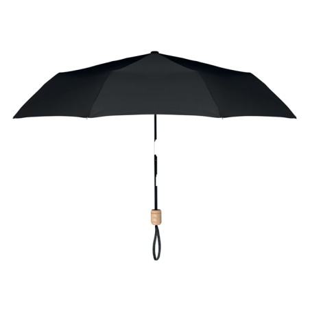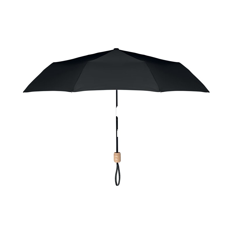 Parapluie pliable de 21'', attributs en pongé 190T RPET,mât et baleines en métal plaqué noir et manche en bois. Ouverture et fermeture manuelles. Pochette individuelle.