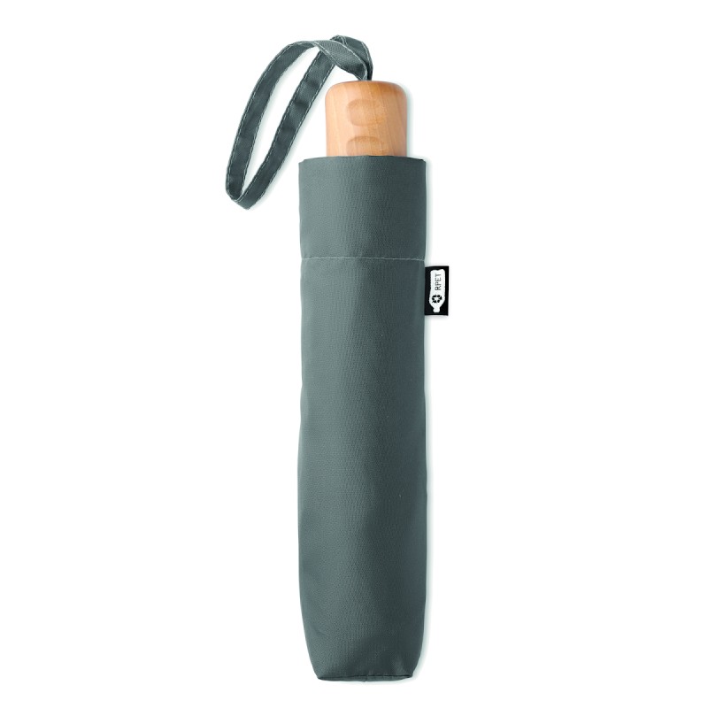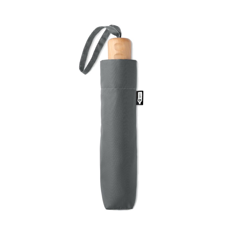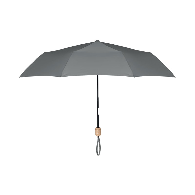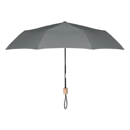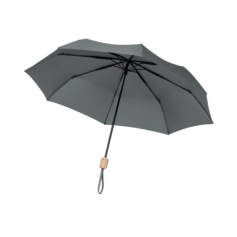 Parapluie pliable de 21'', attributs en pongé 190T RPET,mât et baleines en métal plaqué noir et manche en bois. Ouverture et fermeture manuelles. Pochette individuelle.