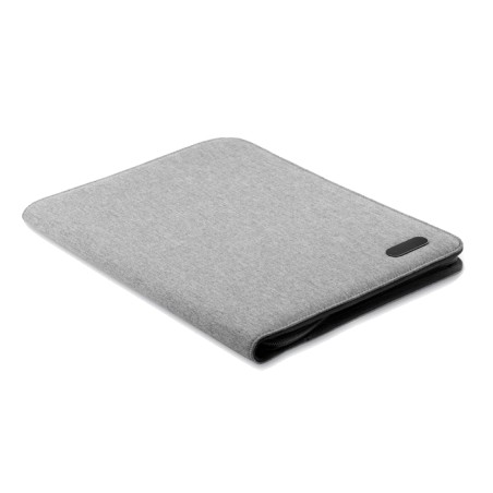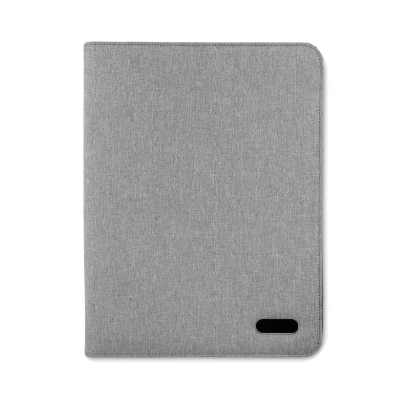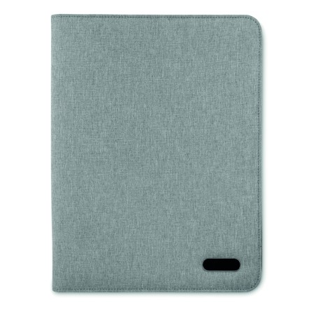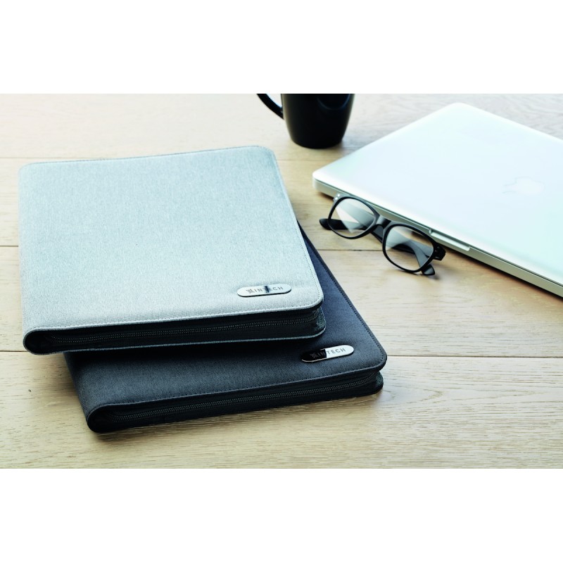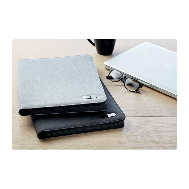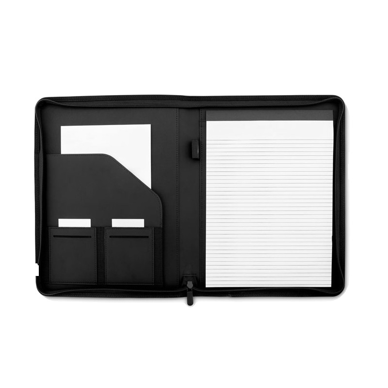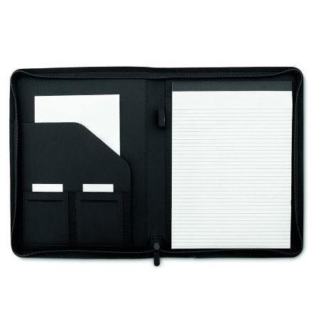 Conférencier A4 en polyester bicolore. Zippé. Bloc-notes de 20 pages lignées. 3 compartiments. Porte-stylo.