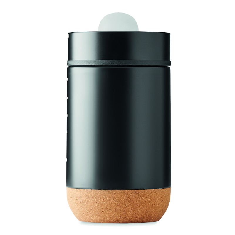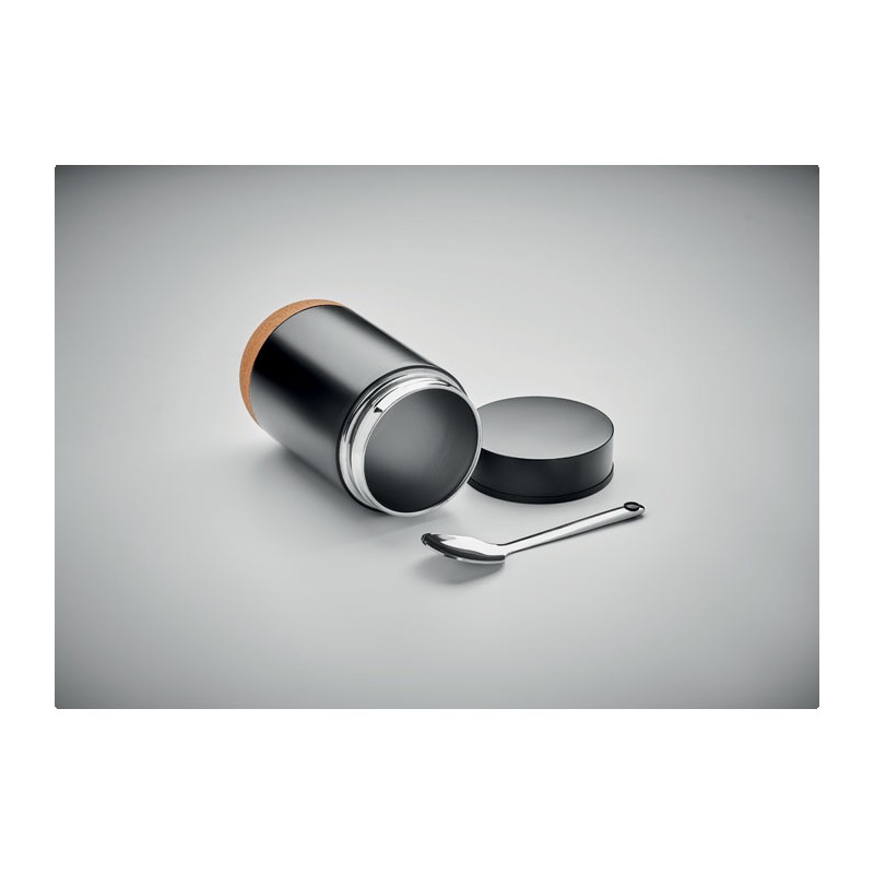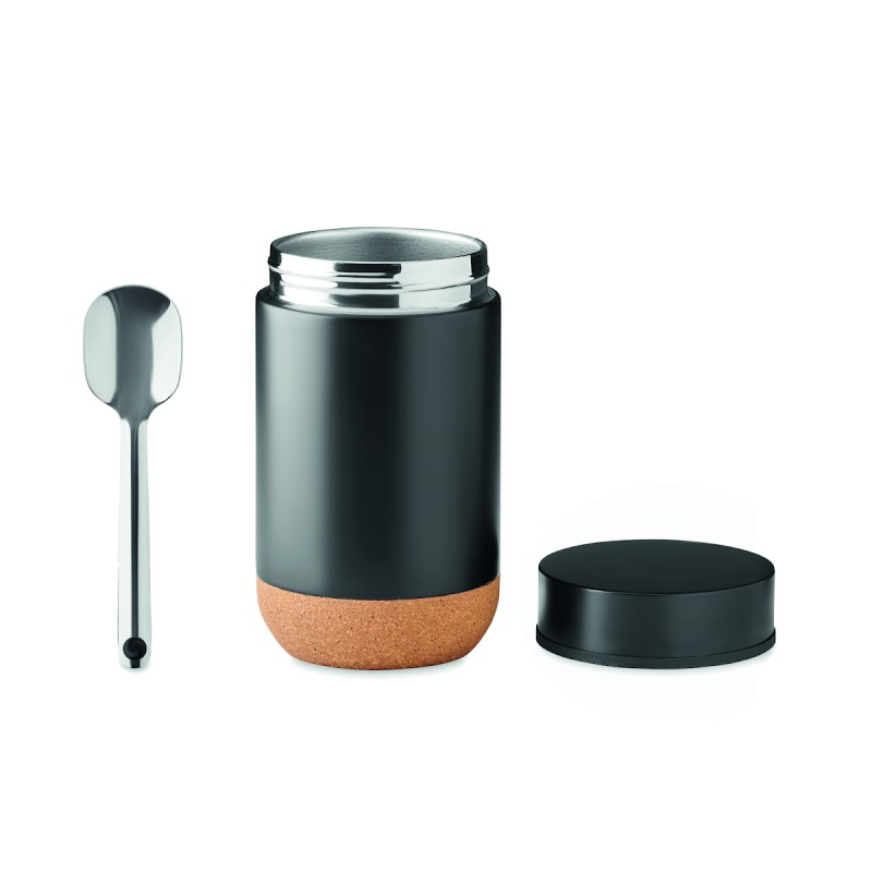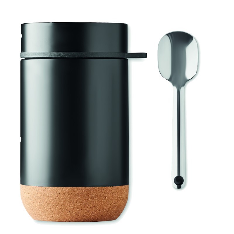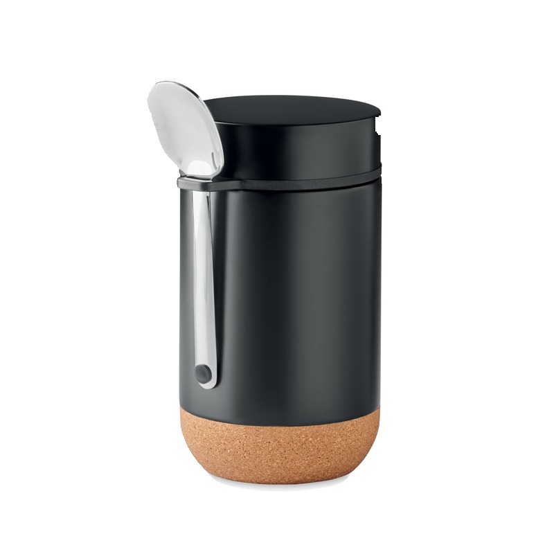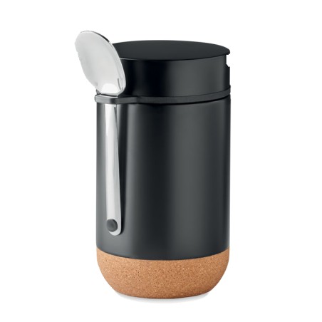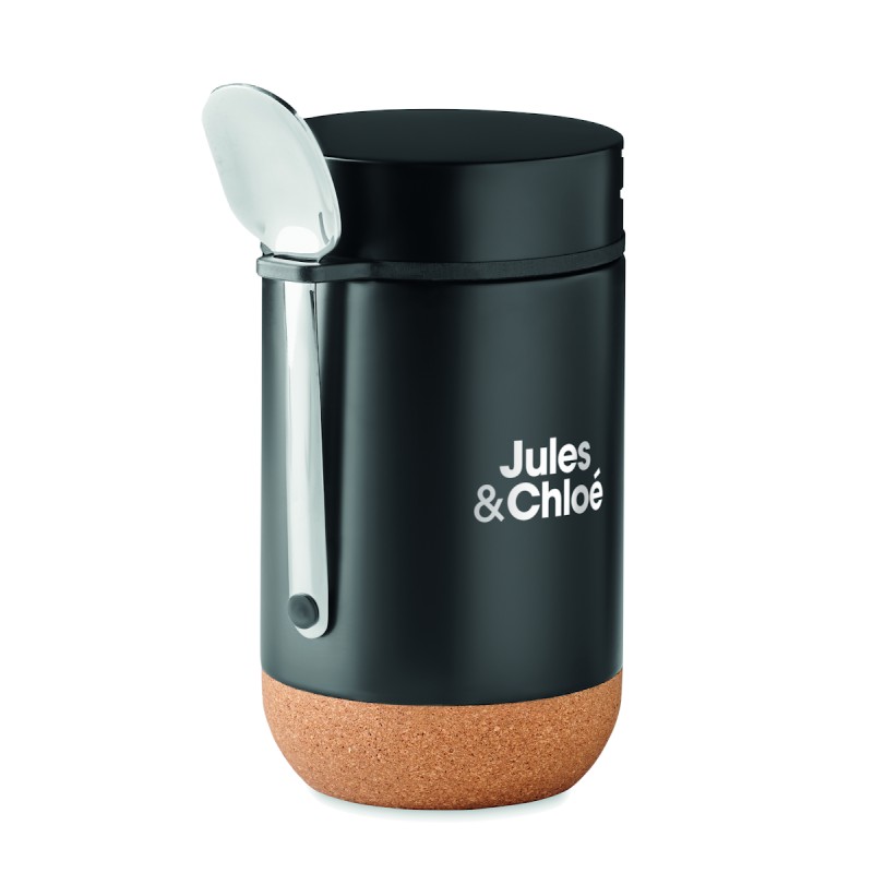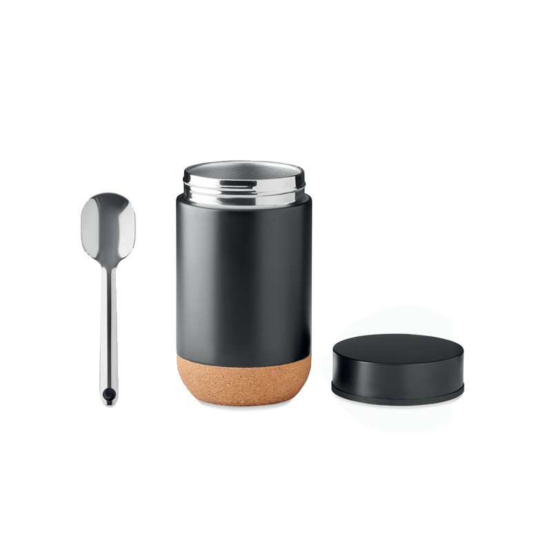 Pot de conservation isotherme en acier inoxydable à double paroi, avec un couvercle à vis et un détail de base en liège. Comprend une cuillère. Capacité : 400ml. Le liège est un matériau 100% naturel. En raison de sa structure et de la porosité de sa surface, le résultat final de l'impression par article peut présenter des différences.