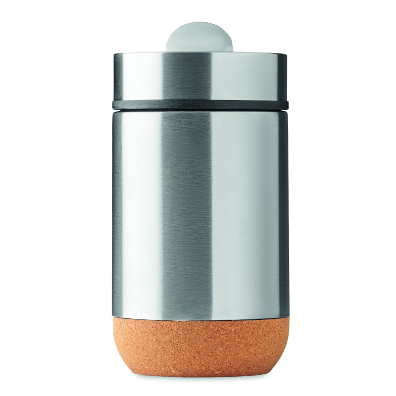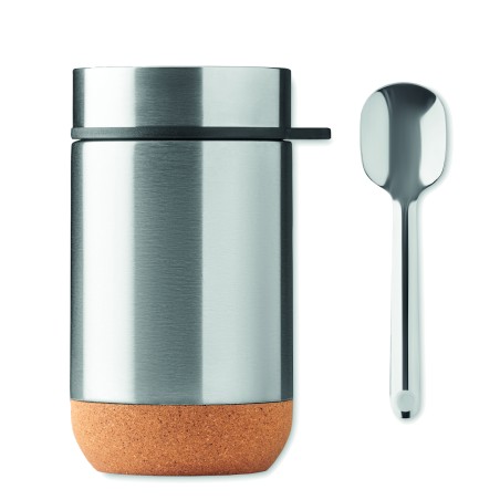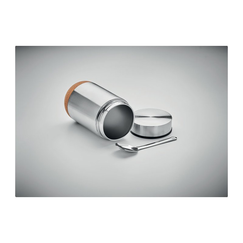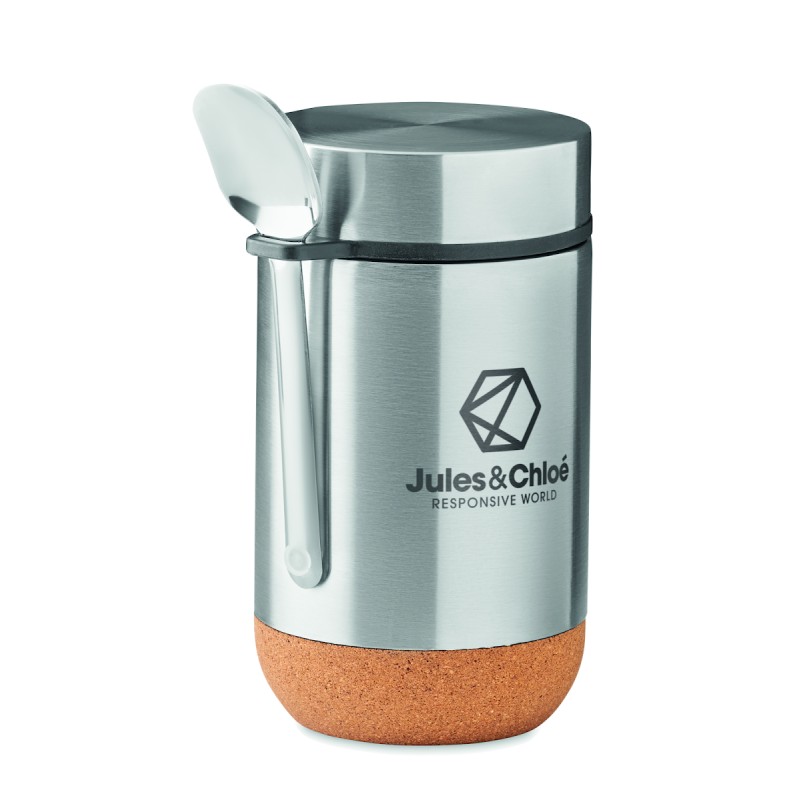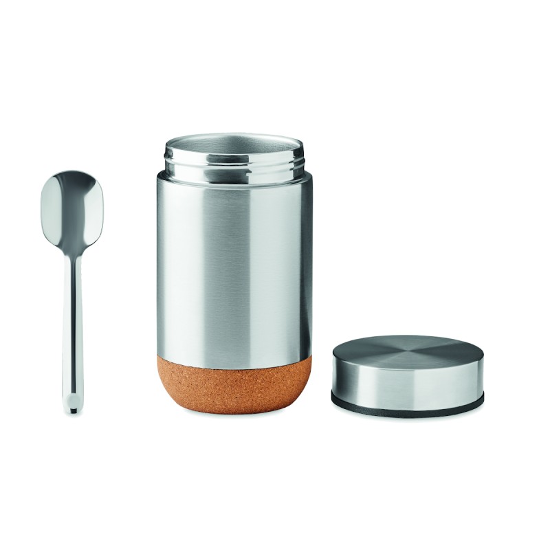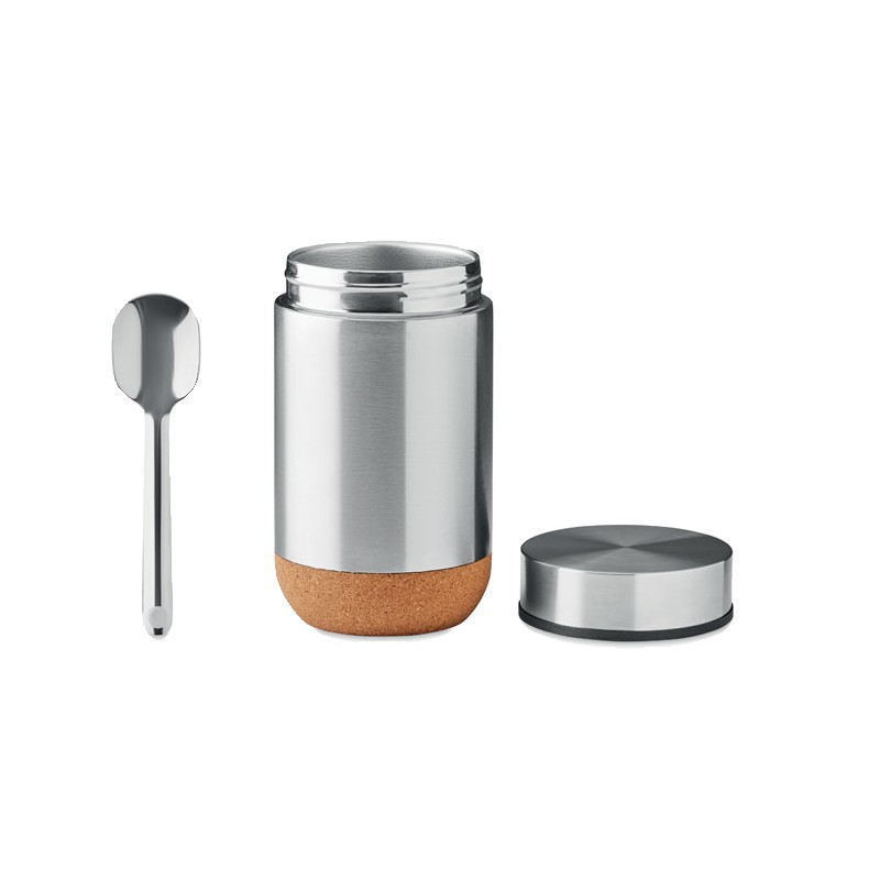 Pot de conservation isotherme en acier inoxydable à double paroi, avec un couvercle à vis et un détail de base en liège. Comprend une cuillère. Capacité : 400ml. Le liège est un matériau 100% naturel. En raison de sa structure et de la porosité de sa surface, le résultat final de l'impression par article peut présenter des différences.