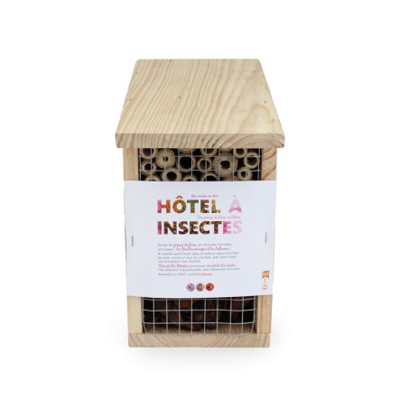 Hôtel à insectes format 285x220x145mm fabriqué en Maine-et-Loire livré avec un sachet de graines de fleurs mellifères pour offrir le couvert en plus du gîte aux insectes pollinisateurs. L’hôtel est fabriqué en ESAT, avec du bois de pin maritime des Landes. Une carte est agrafée avec le sachet de graines sur le devant de l’hôtel.