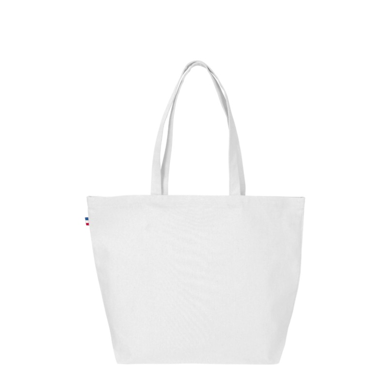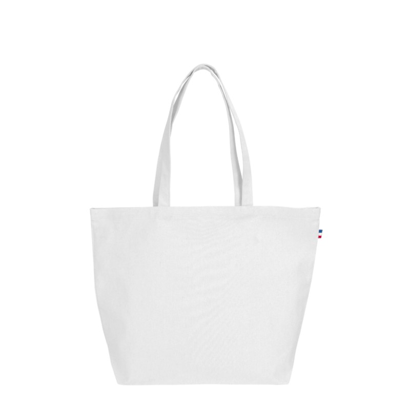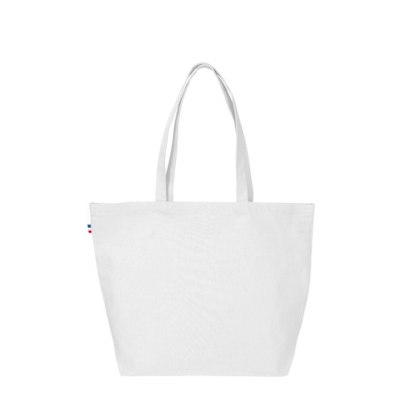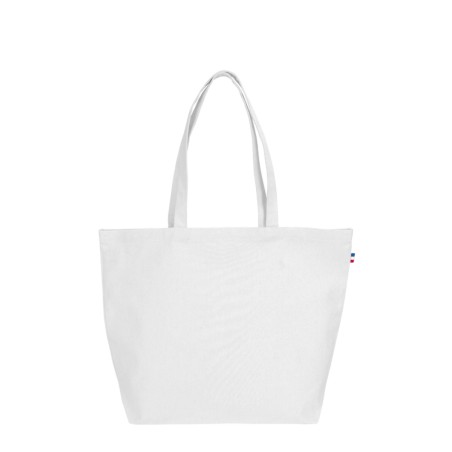 Sac de plage Céline, dimensions 50x38x14cm, Confection France (atelier BF ou ESS), en 100% coton - tissé France, avec anses de 2,5x60cm. Étiquette intérieure de composition avec logo Bonjour François, galon BBR sur le coté du sac. 100 pièces par carton. Demi-natté 240g/m².