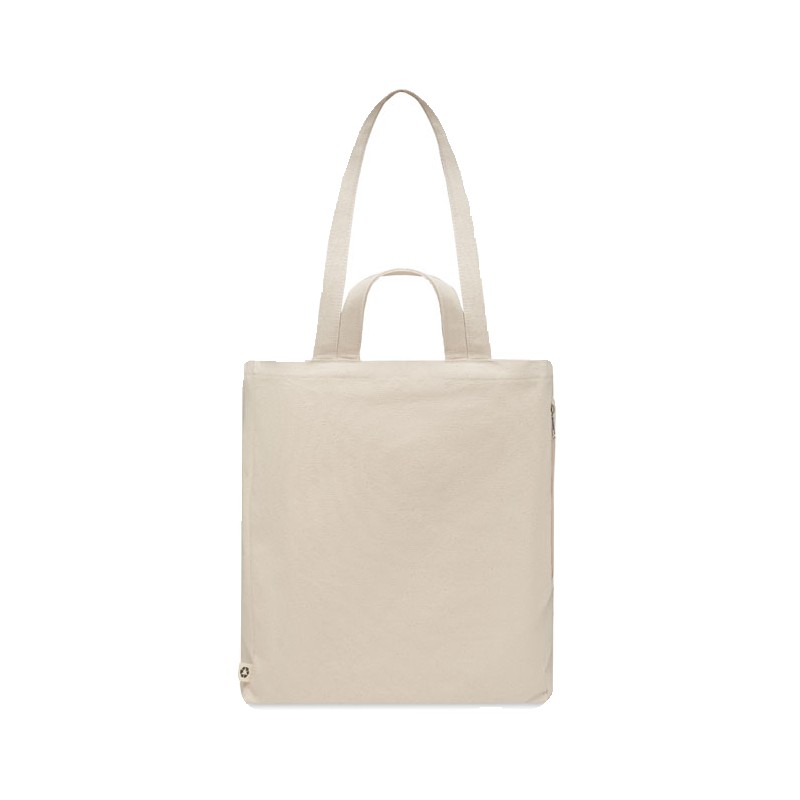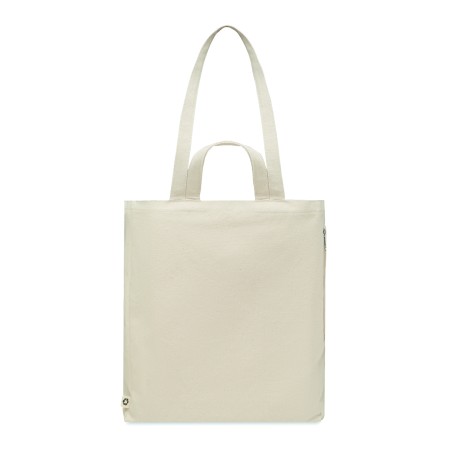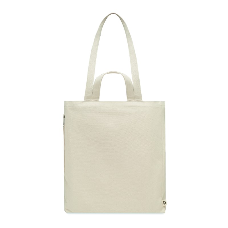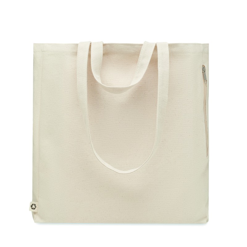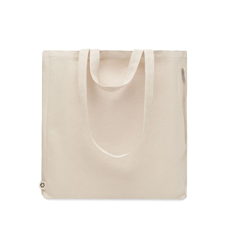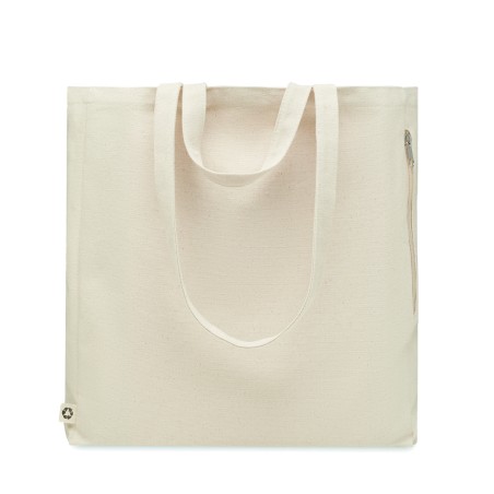 Sac de shopping ou de plage en polycoton recyclé (70 % coton recyclé, 30 % polyester recyclé) avec poignées courtes et longues. Il possède une poche latérale zippée. 380 gr/m².