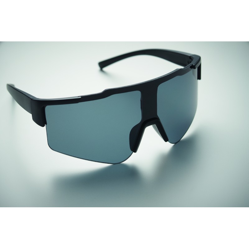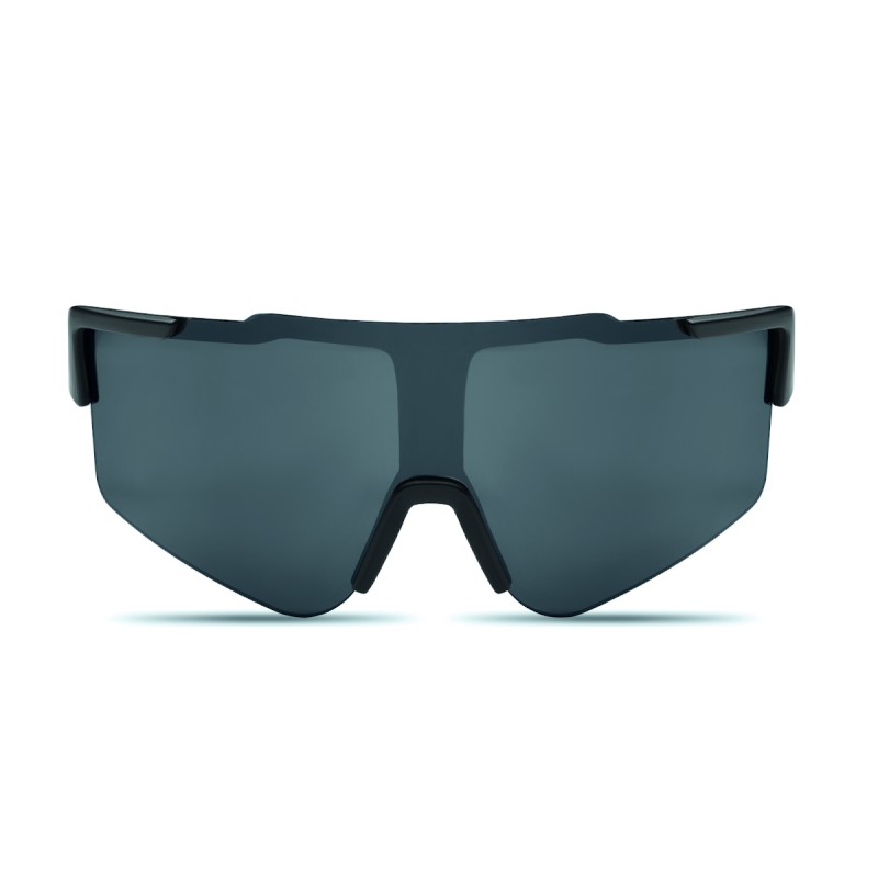 Lunettes de sport avec verres miroirs et monture noire. Protection UV400.
